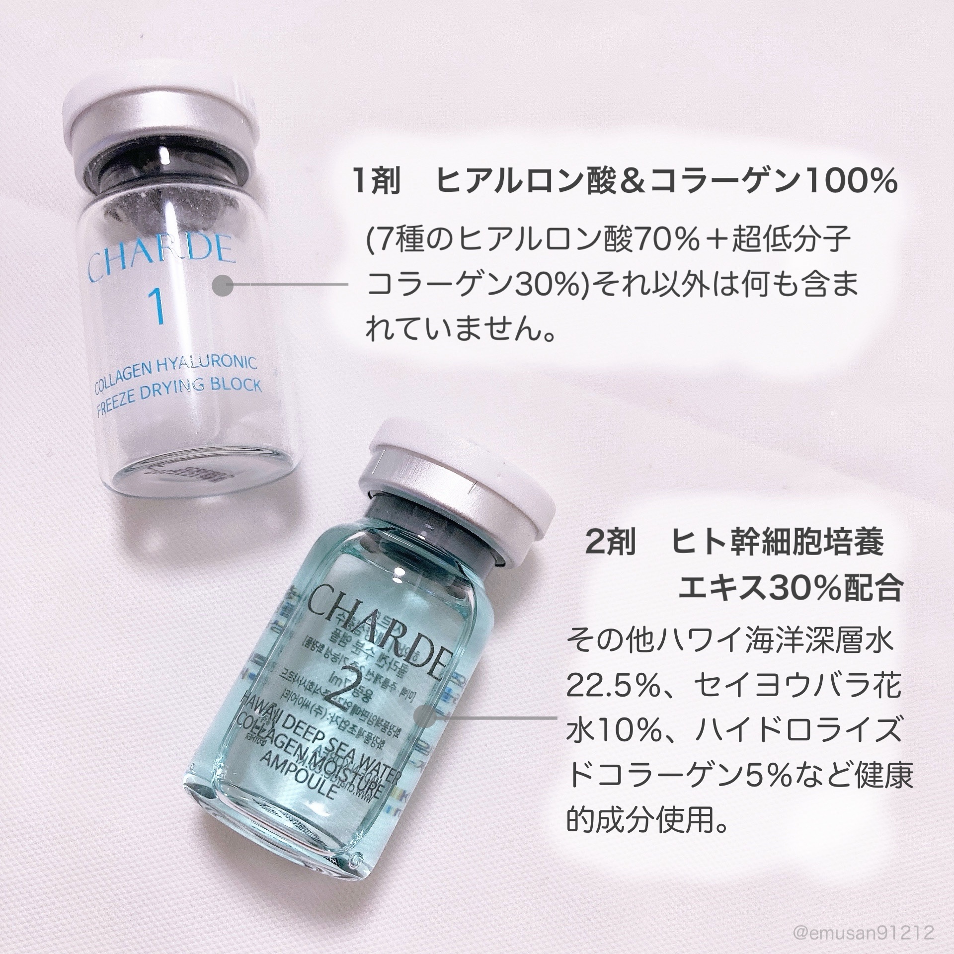 【CHARDE】様よりクラウドアンプル商品提供頂きました。✨1剤のみ防腐剤不使用のため、肌に優しい防腐剤フリーアンプル開封後10日以内のご使用および冷蔵庫での保管を推奨しています。1剤には7種のヒアルロン酸と低分子コラーゲン、2剤には臍帯血幹...