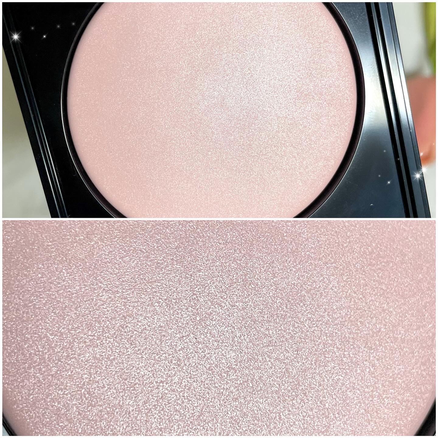 \かわいすぎて事件🤯💘⚡️濡れツヤハイライト/ 上品でキラキラのツヤが美しすぎると発売前から話題でしたね🙌 エナメル+キルティング加工のケースはツルツルぷにぷに♬ 薄型なので持ち運びにも便利!かわいいので無駄に持ち歩こう🙋♀️(?) 細かなピンクパールが温かみのあるツヤを演出してくれます💗 とてもしっとりしたパウダーで粉感がなく、繊細な輝きが長続きします👏 大粒の偏光ラメがギラギラ🤩🥳祭りじゃ〜!といった感じ笑 ホワイトカラーで輝きが目立つので濡れたようなツヤ感が出ます✨ マスクメイクでも頬骨より少し上のCゾーンに入れれば隠れずツヤ感が綺麗に映えます🥰 ラメが大粒で強いのでアイメイクの仕上げに入れても💮 結果万能なのとちょっと奇抜なの♥️ 両方文句なしにかわいかったので満足です🧚♀️笑