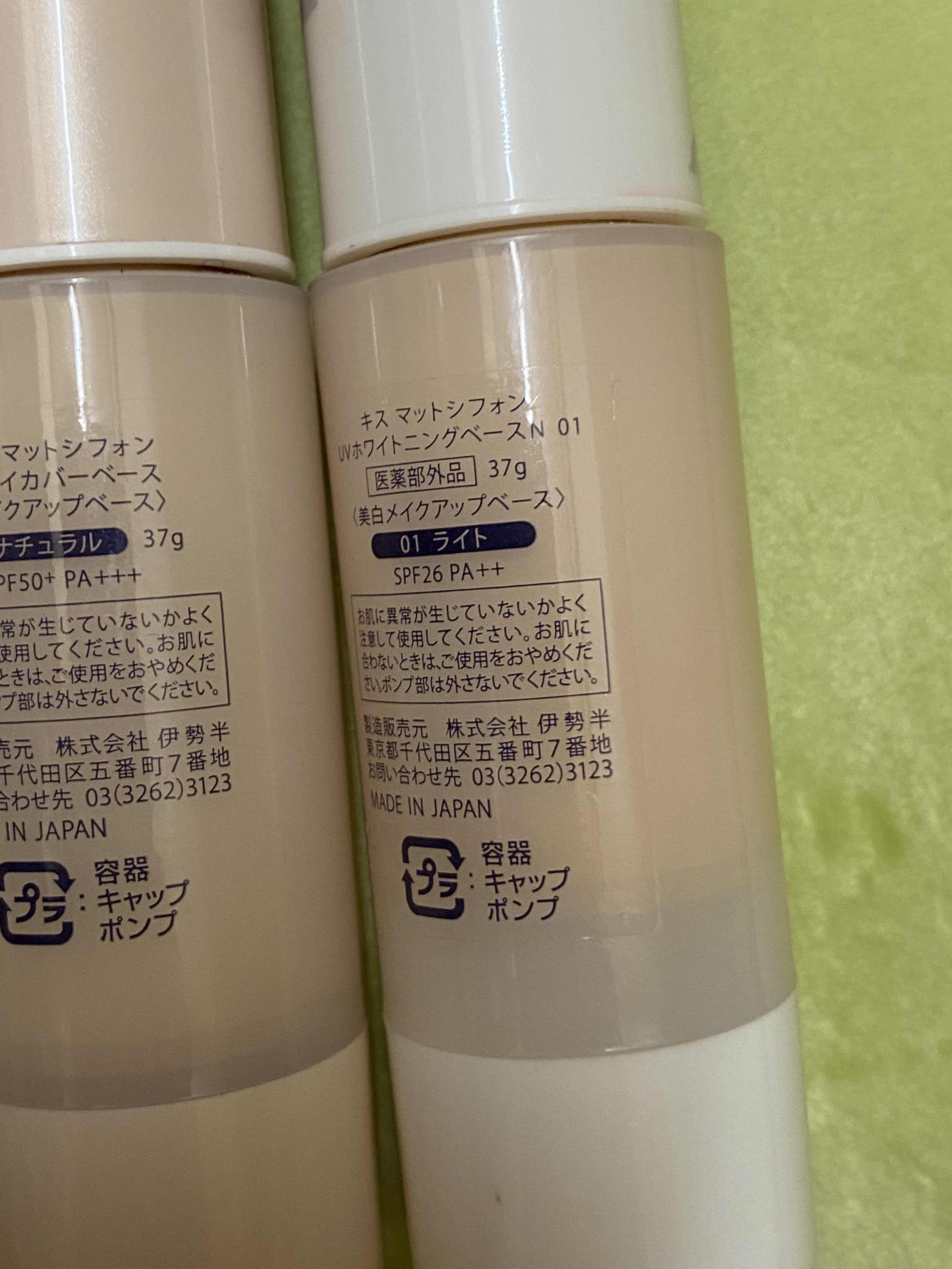 【KiSS マットシフォンUVホワイトニングベースN】 01Light/¥1,760私はTゾーンにのみ、テカリ防止下地として使用しているので約1年でやっと半分くらいになりました。残量がわからないなとずっと思っていて時々中蓋...