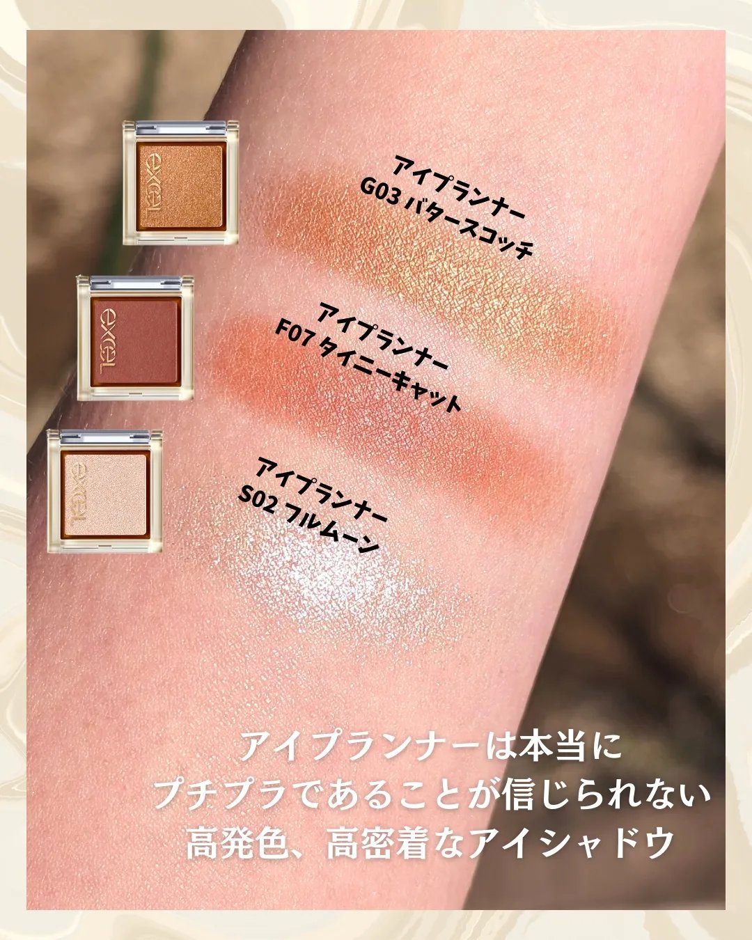 - 「エクセル アイプランナー S/R/F/D」は、質感の異なる4タイプのシングルアイシャドウです。 高輝度パールの“シャイニー”、ツヤ高発色の“リッチ”、新感触セミマットの“フラッフィ”、偏光パールMIXの“ダズル”から、様々な組み合わせをお楽しみいただけます。 単色使いはもちろん、重ねても美しく濁りのないクリアな発色。 フィットオイル*1を配合し、まぶたにピタッと密着して粉飛びやヨレを防ぎます。 集めたくなるシンプル&ミニマムなクリアコンパクトを採用。 色々なカラーやきらめきを自由に組み合わせて、毎日お気に入りの目元をプランニング。 アイメイクの幅が無限大に広がります。 *1 リンゴ酸ジイソステアリル(保湿成分)