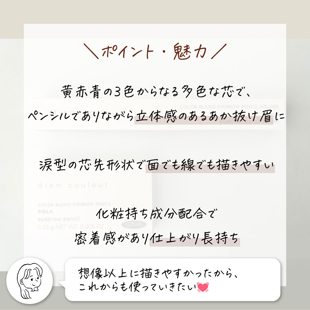- ◆黄・赤・青の3色からなる多色な芯で、ペンシルでありながら立体感のあるあか抜け眉を演出 黒の顔料を使用せず、黄・赤・青の3色を混ぜ合わせ自然な眉色を表現。 多色で芯を構成するため、様々な眉色や髪色にもしっくりなじむ。ニュートラルなブラウンカラー。 ◆涙型の芯先形状で、面でも線でも描きやすい テクニックいらずで、広い面も細い箇所も描きやすい涙型の芯先形状。 ふんわり立体感がありながらも、眉尻などの細かい箇所はシャープで締まった印象へ。 ◆密着感があり、仕上がりが長持ち。化粧もち成分配合 肌や眉毛に密着し、汗・皮脂に強い粉体配合でくずれにくい処方設計。 ウォータープルーフ処方を採用。