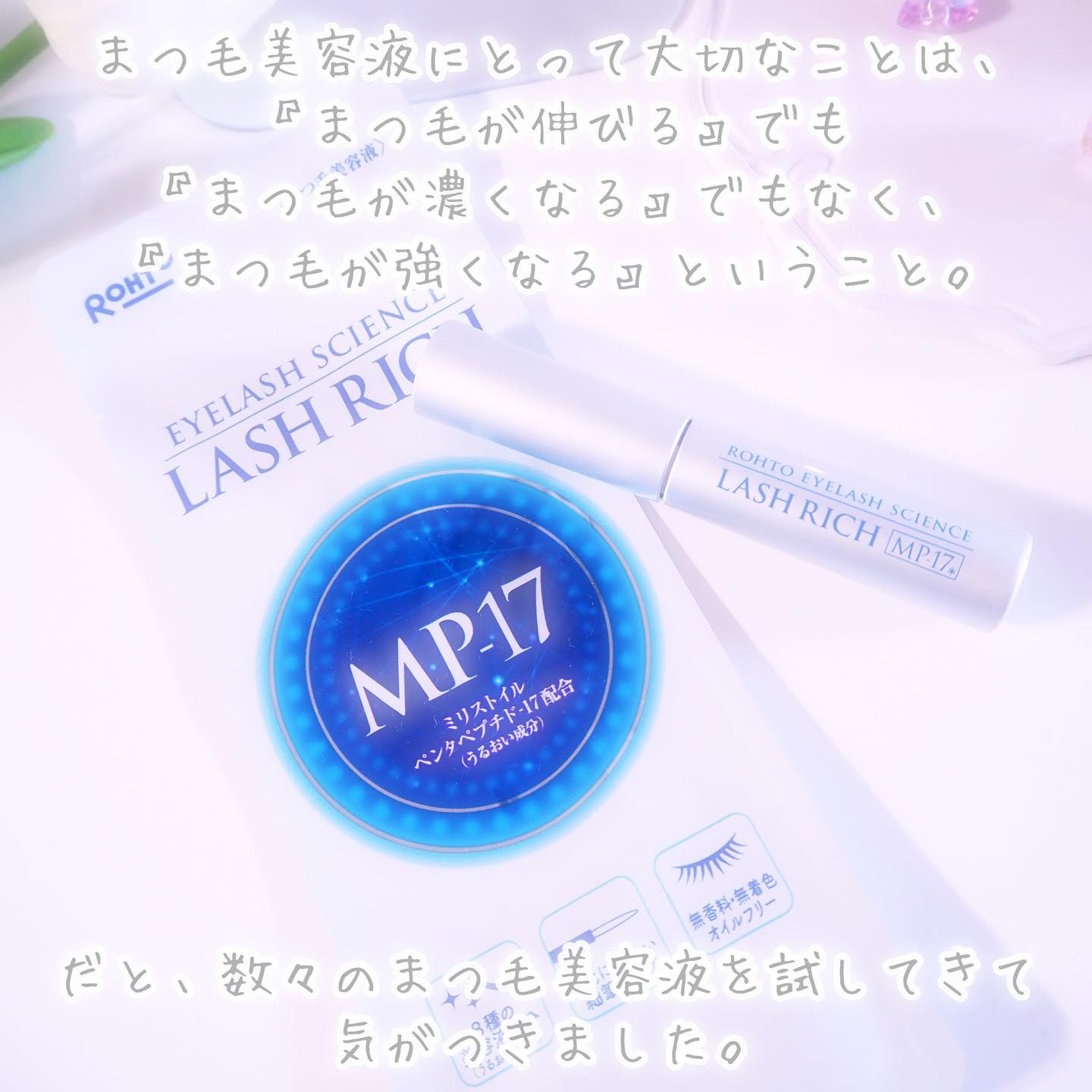 なめらかな使用感の細筆になっていて、まつ毛に塗りやすいです。みずみずしいテクスチャーの美容液で、すっと塗ることが出来ます。 ”ロート製薬が本気で作ったまつ毛美容液” 目の周りや毛髪、皮膚に至るまで多角的に研究を行ってきたロート製薬だからこそ出来た「MP-17(ミリストイルペンタペプチド-17)」配合の国内唯一のまつ毛美容液。