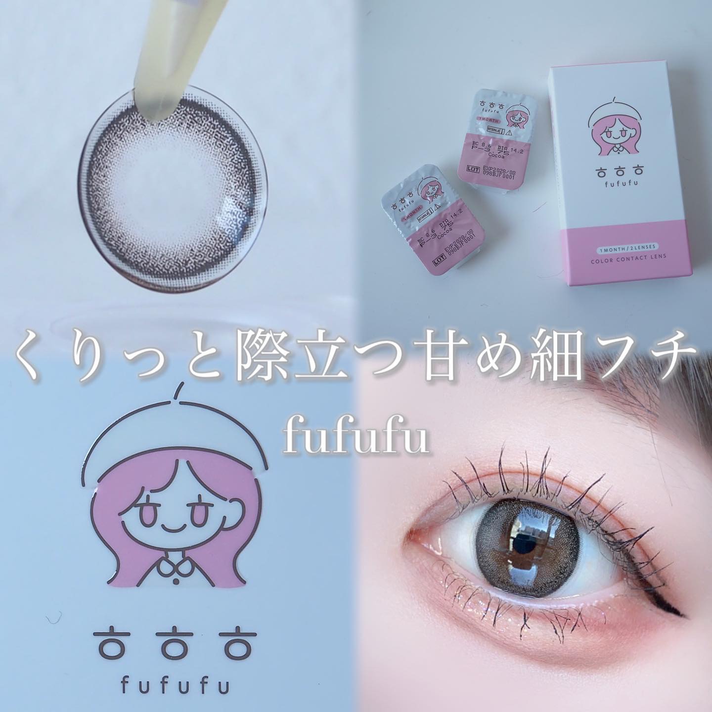 - 「笑顔になれる魔法のカラコン」がコンセプトの新カラコンブランド。 透明感を演出する≪韓国っぽ≫レンズで、毎日にもっと自信を。 ブランド名の「ㅎㅎㅎ(ふふふ)」は、韓国語で"笑い声"を表しています。 ■DIA(直径):14.2mm ■GDIA(着色直径):13.5mm ■BC(ベースカーブ):8.6mm ■含水率:38% ■モイスト:有り ■UVカット:有り(UV-A_約75%以上、UV-B_約95%以上) ●「소다(ソーダ)」 フチあり爽やかグレー ふんわりフチ×透明感で、じゅわっと溶け込むソーダグレー ●「바나나우유(バナナミルク)」 フチあり儚げベージュ ふんわりフチ×透明感で、あざとかわいいミルクベージュ ●「카페올레(カフェオレ)」 アカ抜けうるふわブラウン ナチュラル×透明感で、ふんわり優しいうるみブラウン ●「코코아(ココア)」 愛されドーリーブラウン 黒フチ×立体感で、ほどよく甘いピンクブラウン コンタクトレンズの不適正使用による眼障害の危険性等などがあります。 ●コンタクトレンズは高度管理医療機器です。不十分な洗浄・消毒など不適切なケアや、長時間・交換期間を超えた装用により、アレルギー性結膜炎、角膜感染症、角膜潰瘍等の重篤な眼障害が発生する危険性があります ●ご使用前に取扱説明書を確認してください 使用上の留意事項 ●眼科医院等を受診してからお求めください ●眼に異常を感じたら直ちにレンズ使用を中止し、お近くの眼科等で診察を受けてください ●医師の指示にしたがってご使用ください ●コンタクトレンズを装用する場合、自覚症状がなくても、眼科医院等での定期検査を受けてください ●レンズに不具合がある場合は使用しないでください