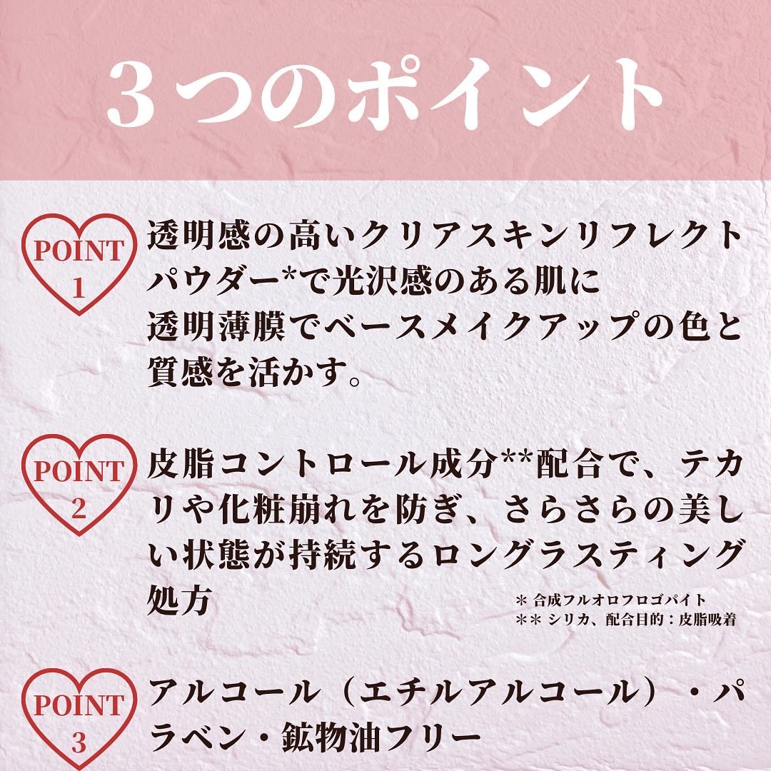 - 肌に溶け込むようになじんだ繊細なパウダーが光をリフレクトし、自然なツヤと立体感をもたらします。どこまでもクリアで粉感を感じさせず、二次付着しないスムースな肌へ。 ●透明感の高いクリアスキンリフレクトパウダー*で光沢感のある肌に ●透明薄膜でベースメイクアップの色と質感を活かします ●皮脂コントロール成分** 配合で、テカリや化粧崩れを防ぎ、さらさらの美しい状態が持続するロングラスティング処方 ●アルコール(エチルアルコール)・パラベン・鉱物油フリー ●ヴィーガンフレンドリー ●パッチテスト済み*** ●無香料 * 合成フルオロフロゴパイト ** シリカ、配合目的:皮脂吸着 *** 全ての方に皮膚刺激が起きないわけではありません