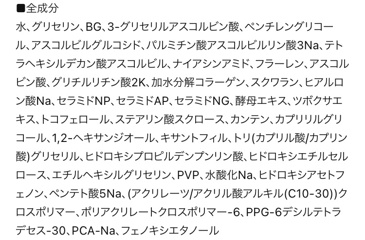 - <30ml> 水、グリセリン、BG、3-グリセリルアスコルビン酸、ペンチレングリコール、アスコルビルグルコシド、パルミチン酸アスコルビルリン酸3Na、テトラヘキシルデカン酸アスコルビル、ナイアシンアミド、フラーレン、アスコルビン酸、グリチルリチン酸2K、加水分解コラーゲン、スクワラン、ヒアルロン酸Na、セラミドNP、セラミドAP、セラミドNG、酵母エキス、ツボクサエキス、トコフェロール、ステアリン酸スクロース、カンテン、カプリリルグリコール、1,2-ヘキサンジオール、キサントフィル、トリ(カプリル酸/カプリン酸)グリセリル、ヒドロキシプロピルデンプンリン酸、ヒドロキシエチルセルロース、エチルヘキシルグリセリン、PVP、水酸化Na、ヒドロキシアセトフェノン、ペンテト酸5Na、(アクリレーツ/アクリル酸アルキル(C10-30))クロスポリマー、ポリアクリレートクロスポリマー-6、PPG-6デシルテトラデセス-30、PCA-Na、フェノキシエタノール