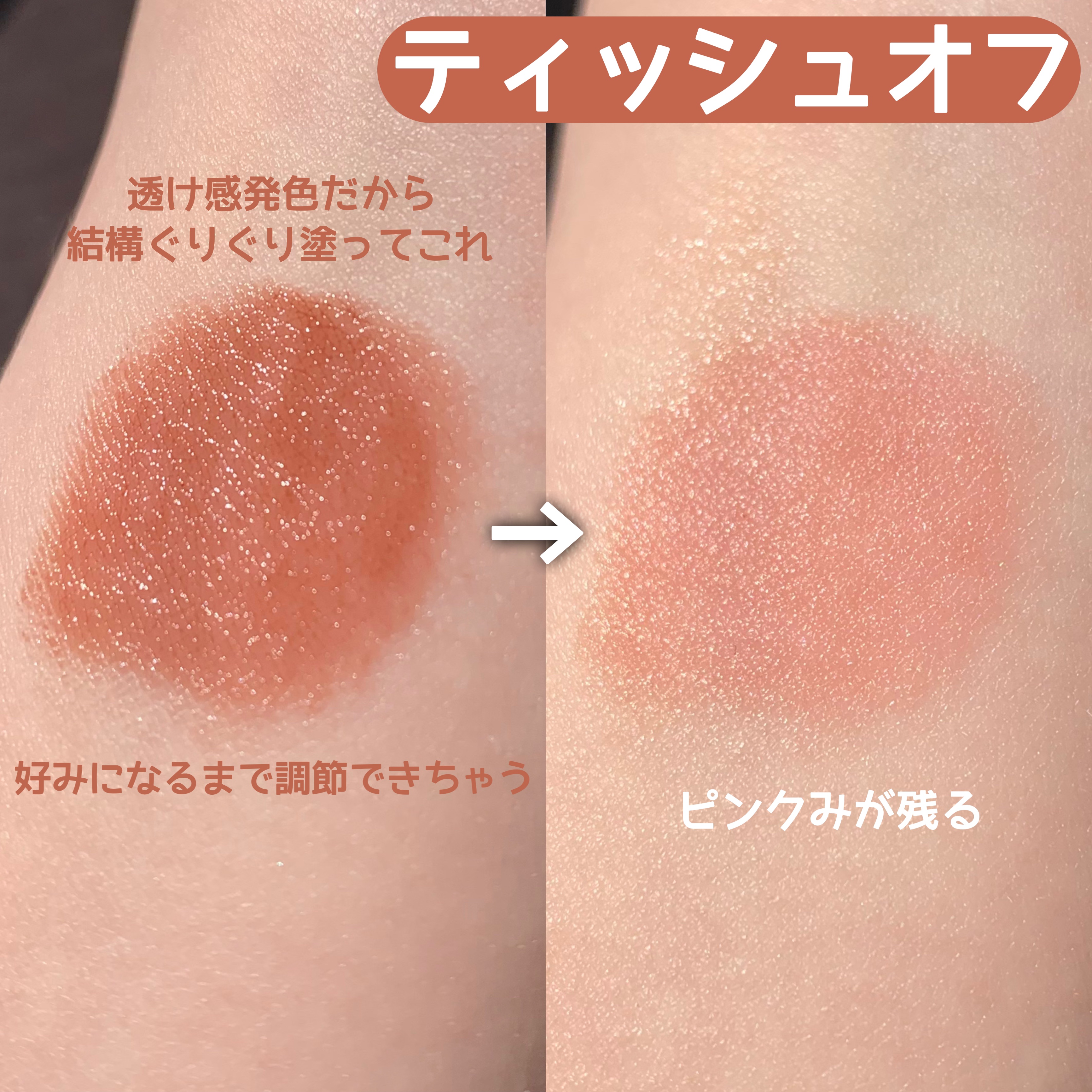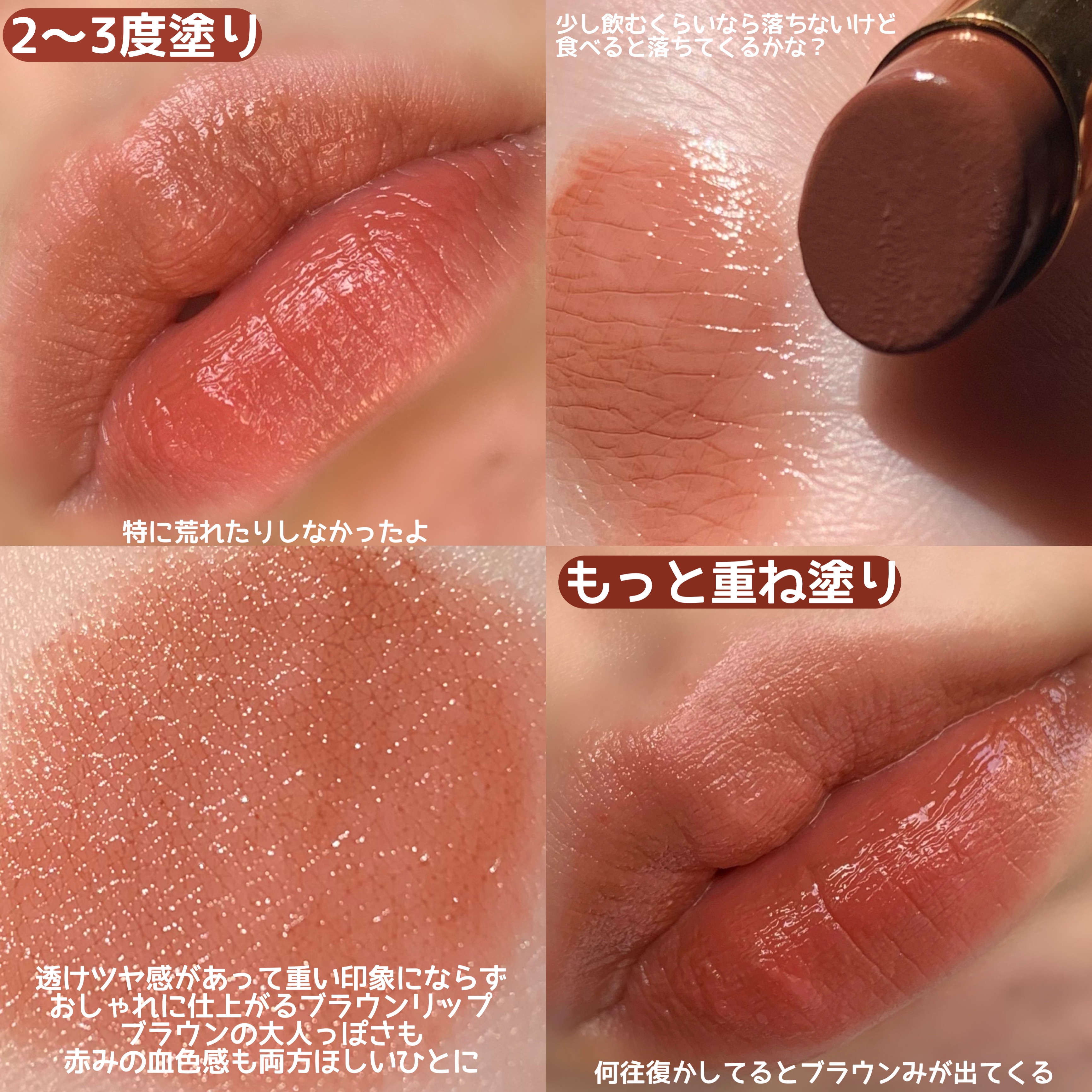 とにかくみずみずしい塗り心地 軽い着け心地 水ツヤ感がグロスとはひと味違った魅力! カラバリも水ツヤ感も大好きで 私もマスクメイクの日はもちろんいつものお出かけにも重宝してる🥺 テクスチャーともけもけチップと相まって するする乗るのがとても心地よくて いつも使うリップと正反対だったけれどたくさん使うようになった! 素の唇を美しく存在感を見いだすようなラインナップとして 肌馴染みの良いローズなどだけではなくて どきっとするようなエッジィなカラーに 遊び心のある洒落たカラーまで揃っていて たくさん集めたくなる🫠