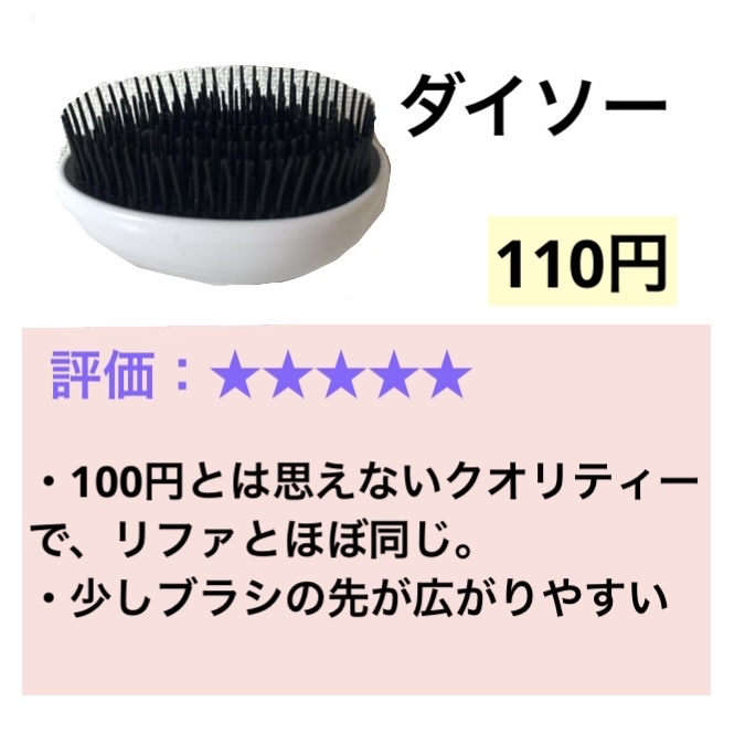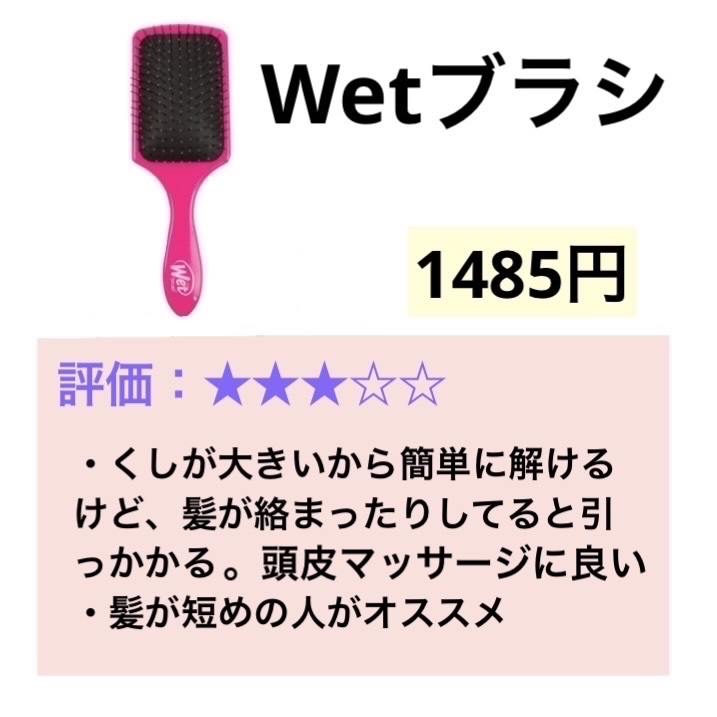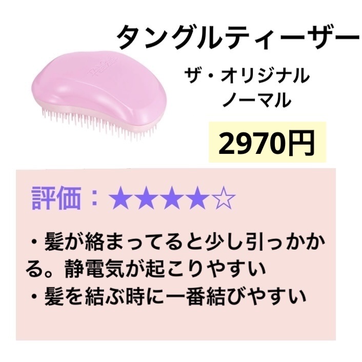 髪を乾かす時にも◎ ブラシの先が柔らかくて、解きやすい。髪を結ぶ時は少し結びにくい 見た目が可愛くて持ってるだけでテンションが上がる ブラシの先が硬めでしっかり髪を解ける感じがある 髪が短めな人にオススメ ブラシの先が硬めで、解いた感じはタングルティーザーと似てるけどタングルティーザーよりも絡まりにくい すごい安いから一つは持っておくと良い!