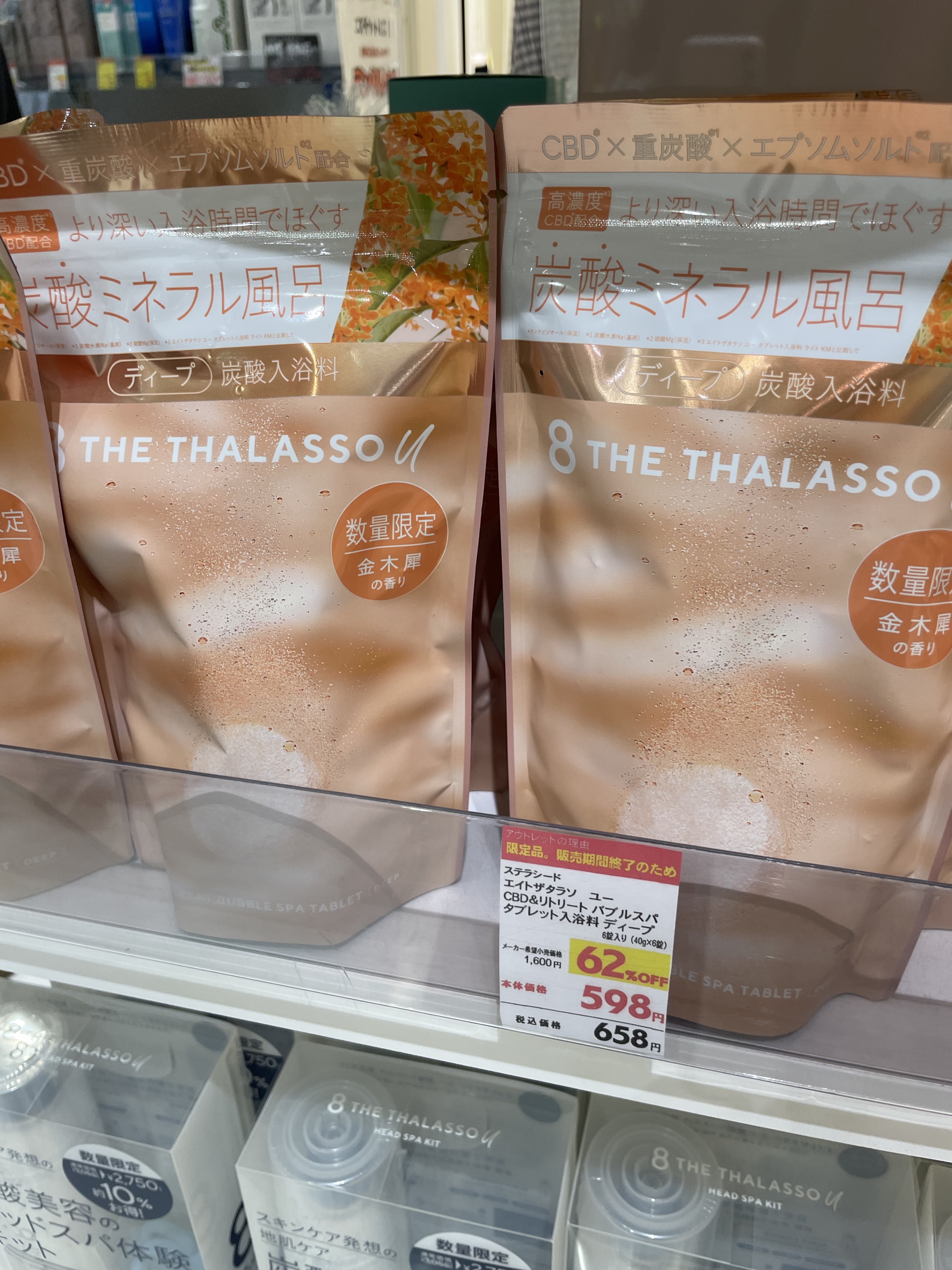 - 数量限定発売 自宅で炭酸スパが楽しめる、「CBD*1×重炭酸*2×エプソムソルト*3」配合のタブレット入浴料。海の恵みを凝縮した重炭酸*2スパで芯までじんわり温かく。さらに、柔らかくなめらかなお湯がカラダをやさしく包み込み、肌の潤いを保ちながら健やかに整えます。「ディープ」タイプは、CBD*1を高濃度*4配合。より深い安らぎの温浴タイムを楽しめます。ディープオレンジのお湯色。キンモクセイの香り。 *1カンナビジオール *2炭酸水素Na(基剤) *3硫酸Mg(保湿) *4エイトザタラソ ユー タブレット入浴料 ライトと比較して