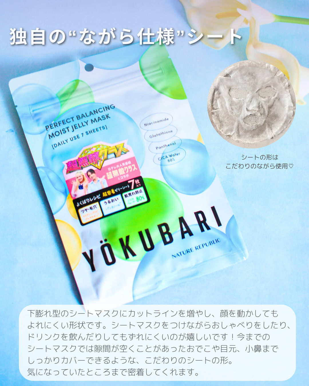 - 独自のシート設計“ながら仕様”と4つの美容成分でスキなし美肌を目指すシートマスクです。 <独自設計“ながら仕様”のシート> 「スキンケアの時間を有効活用したい」というよくばりに応え、独自の“ながら仕様”シートを開発。 下膨れ型のシートマスクにカットラインを増やしたことで、顔を動かしてもよれにくい形状となりました。シートマスクをつけながらおしゃべりをしたり、ドリンクを飲んだりしてもずれにくいシートとなっています。 さらに、隙間の空きやすいおでこや目元、小鼻までしっかりカバーできるようシートの形を改良し、気になっていたところまで逃さず密着保湿していただけるようになっています。 <4つの美容成分配合のよくばりレシピ> 毛穴(*1)をケアし肌につやを与えるナイアシンアミド(*2)、グルタチオン(*2)、 うるおいを与え保水するパンテノール(*3)といった話題の美容成分を配合しているほか、 精製水の代わりにCICAウォーター(*3)を80%配合し肌荒れを防ぎます。 時短で集中ケアがかなうよくばりレシピです。 <ぷるぷる新感覚のゼリー素材> まるでゼリーのようなぷるぷる質感の100%天然由来のシート素材を採用。 ピタッと密着して肌を包み込みます。 *1乾燥により目立つ毛穴 *2保湿成分 *3ツボクサ葉水(保湿成分)