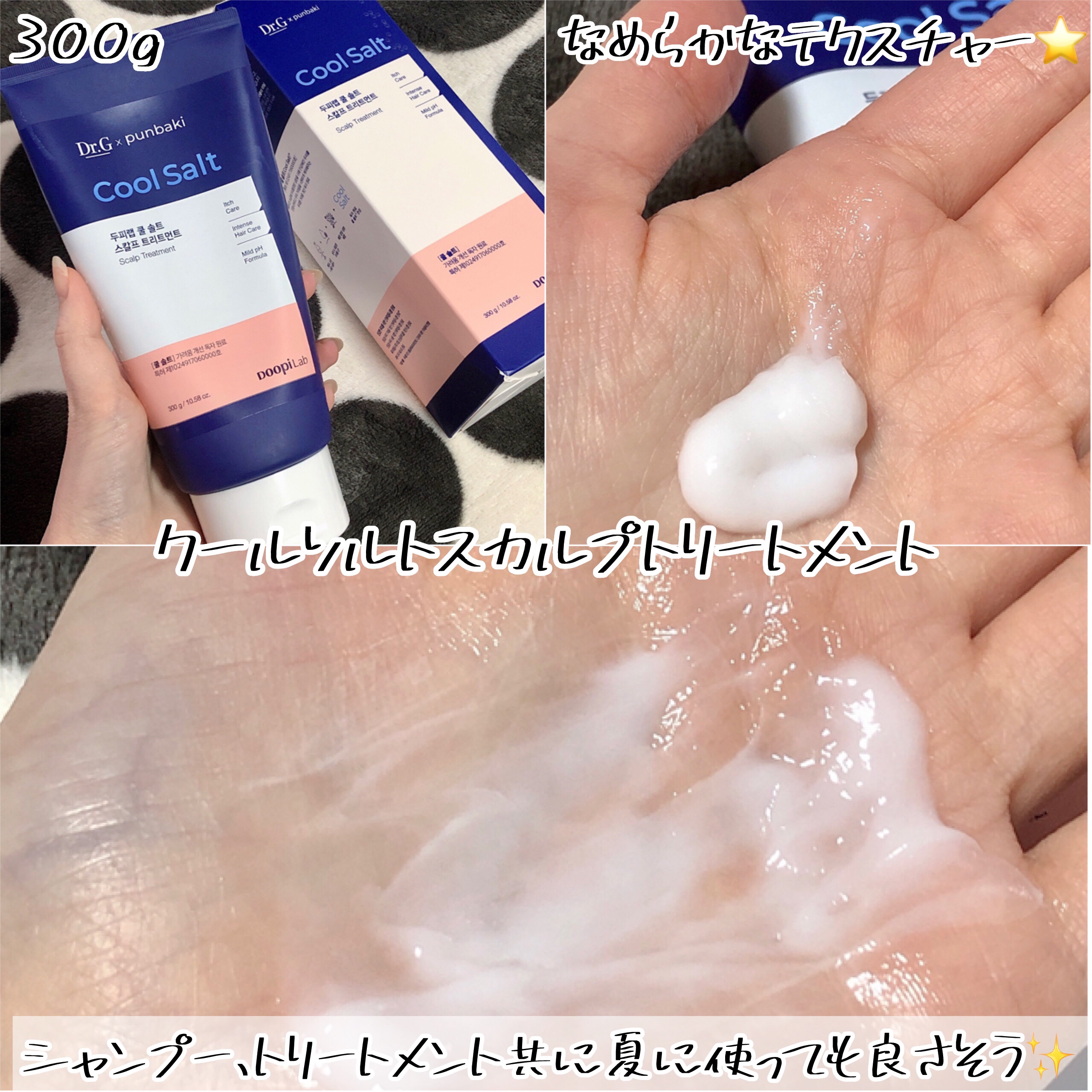 - ヘアケアラインは、頭皮も肌だ!ということで開発されました。 全商品に、クールソルト*が含まれており、頭皮を健やかに保ちます。 クールソルトは、3年の研究期間を経て、フランスの下ランド産の天然塩を液体状にし、ミネラル成分を最大限に活かせるように開発された、Dr.G独自の整肌成分です。敏感な肌を整え、頭皮をすっきりさせます。 シャンプー:パンテノール*やナイアシンアミド*が含まれており、ハリ・コシケアを助け、タンパク質*とアミノ酸*でキューティクルをケアします。さらに、3種のシカ成分*が頭皮を健やかに保ちます。 トリートメント:タンパク質*やアミノ酸*、ケラガード*で毛髪やキューティクルを守り、傷んだ髪を補修します。 ノンシリコンで、頭皮にも使え、頭皮をパックすることができます。 *整肌成分