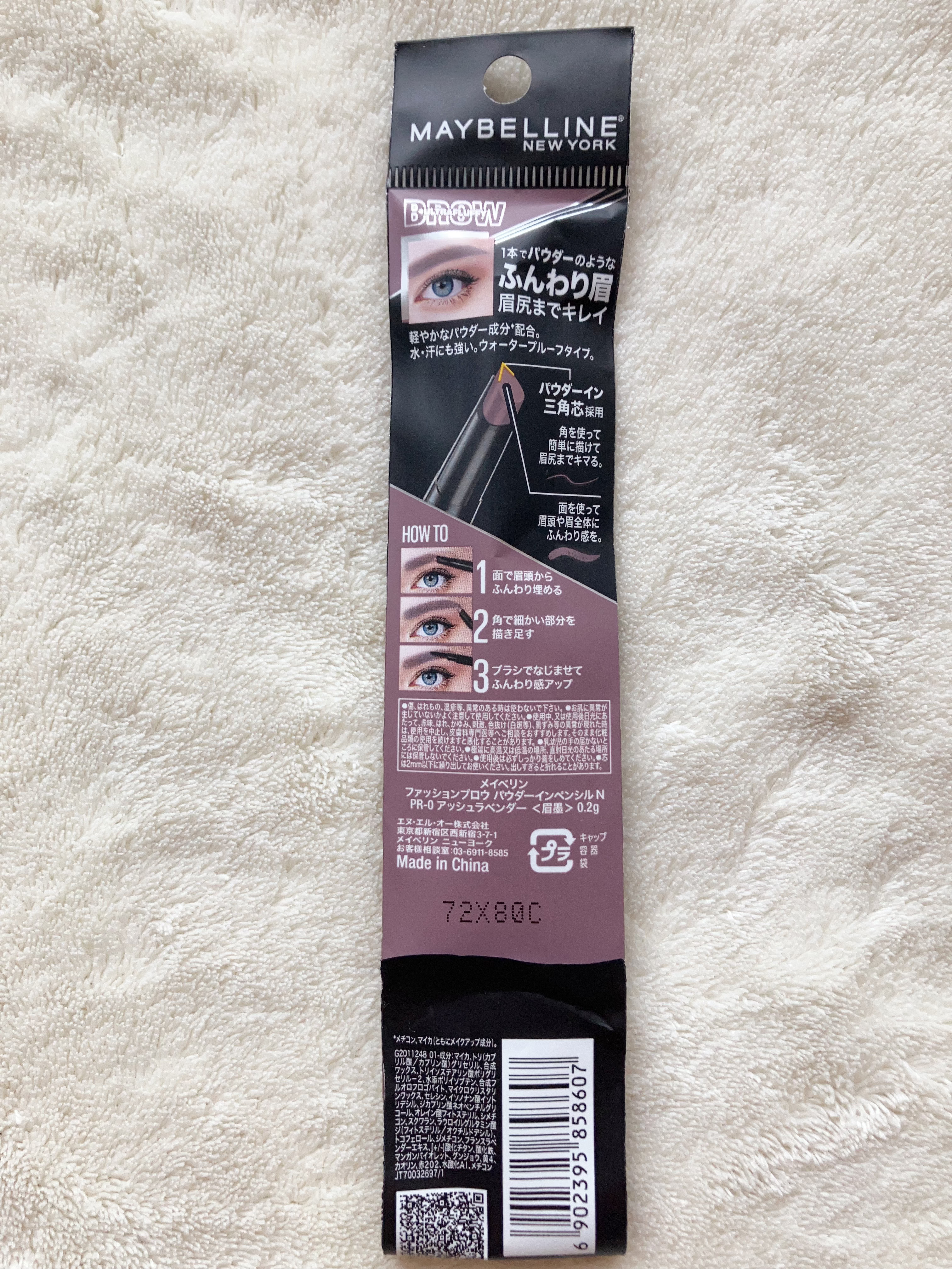 - <2020年3月14日「ファッションブロウ パウダーインペンシル」から「ファッションブロウ パウダーインペンシル N」に名称変更> パウダーのようなふんわり自然な仕上がりなのに、眉毛にしっかり密着、落ちにくい。長時間*²、自然な仕上がりをキープしてくれます。汗・水にも強いウォータープルーフタイプ。 ■1本で様々なラインが自由自在に描ける三角カット芯 角:眉尻もラクラク描き足せる。 表面:眉頭や眉全体に自然な立体感を。 ■・密着パウダー成分配合 描くだけでパウダーのようなふんわりぼかした印象に。しかも眉毛に密着するから長時間*² 仕上がりキープ。 *2 メイベリン ニューヨーク調べ(個人差があります)。
