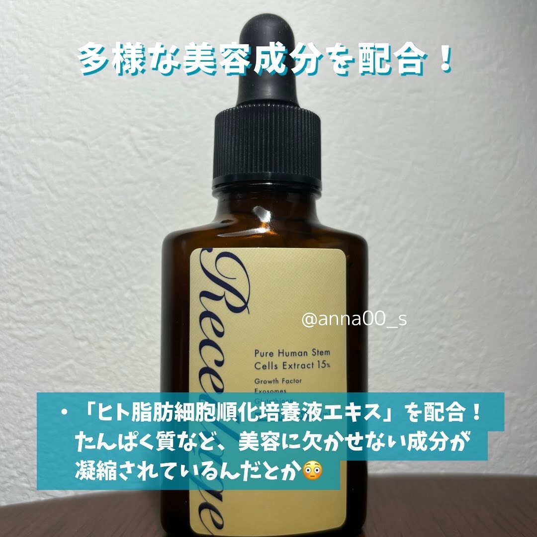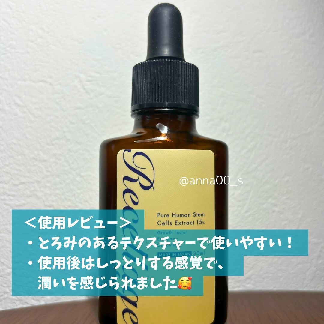 高濃度ヒト幹細胞培養液を15%も贅沢に配合している美容液とのこと。 紫外線ダメージやシミ・くすみケアが期待できるというアスタキサンチンも配合されているのだとか。 シワやたるみを改善する効果が期待できる美容成分で、レチノールよりも刺激が少なく、肌にはりを与えてくれると言われている「バクチオール」も配合という贅沢さ。