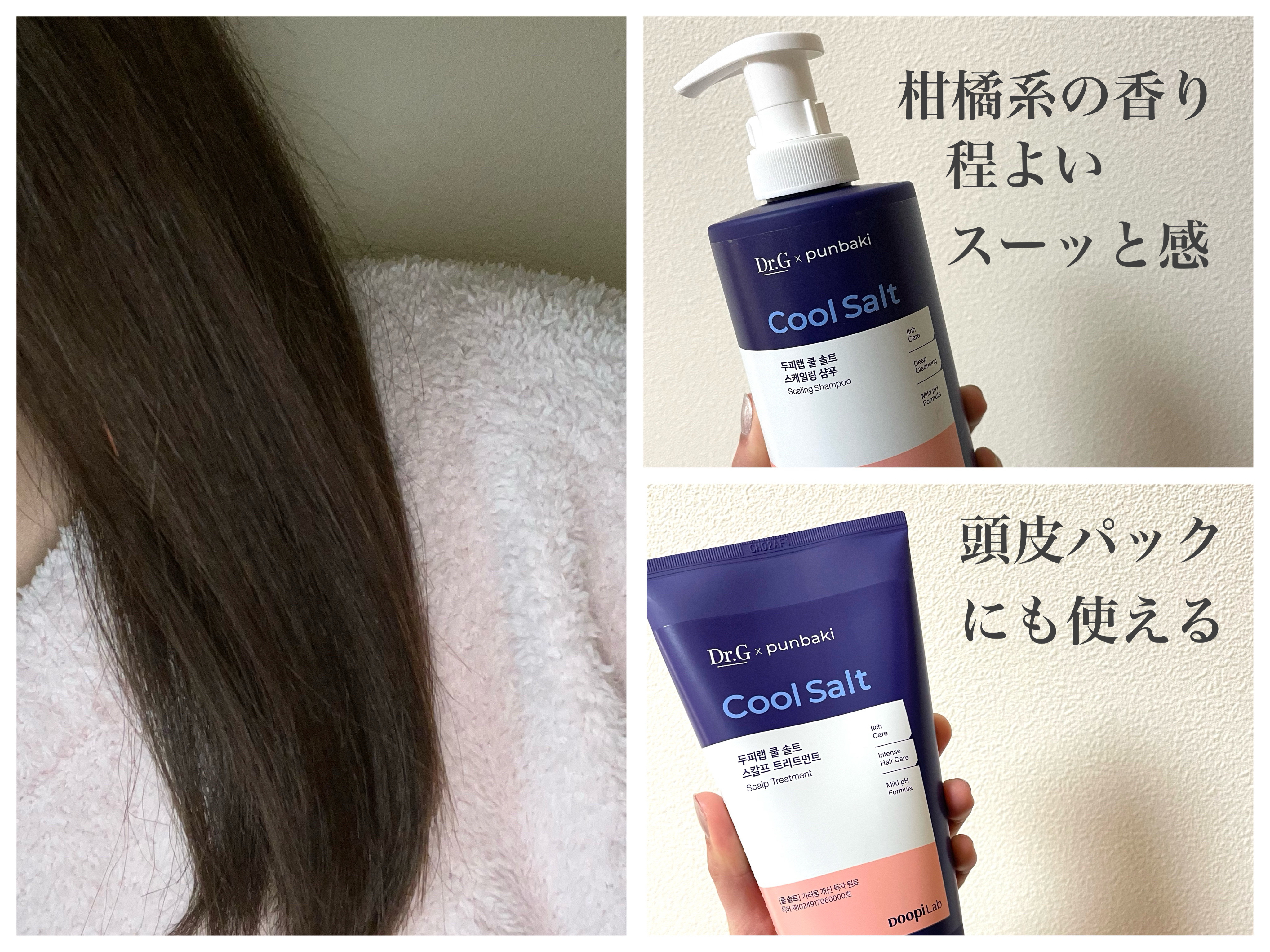 - ヘアケアラインは、頭皮も肌だ!ということで開発されました。 全商品に、クールソルト*が含まれており、頭皮を健やかに保ちます。 クールソルトは、3年の研究期間を経て、フランスの下ランド産の天然塩を液体状にし、ミネラル成分を最大限に活かせるように開発された、Dr.G独自の整肌成分です。敏感な肌を整え、頭皮をすっきりさせます。 シャンプー:パンテノール*やナイアシンアミド*が含まれており、ハリ・コシケアを助け、タンパク質*とアミノ酸*でキューティクルをケアします。さらに、3種のシカ成分*が頭皮を健やかに保ちます。 トリートメント:タンパク質*やアミノ酸*、ケラガード*で毛髪やキューティクルを守り、傷んだ髪を補修します。 ノンシリコンで、頭皮にも使え、頭皮をパックすることができます。 *整肌成分