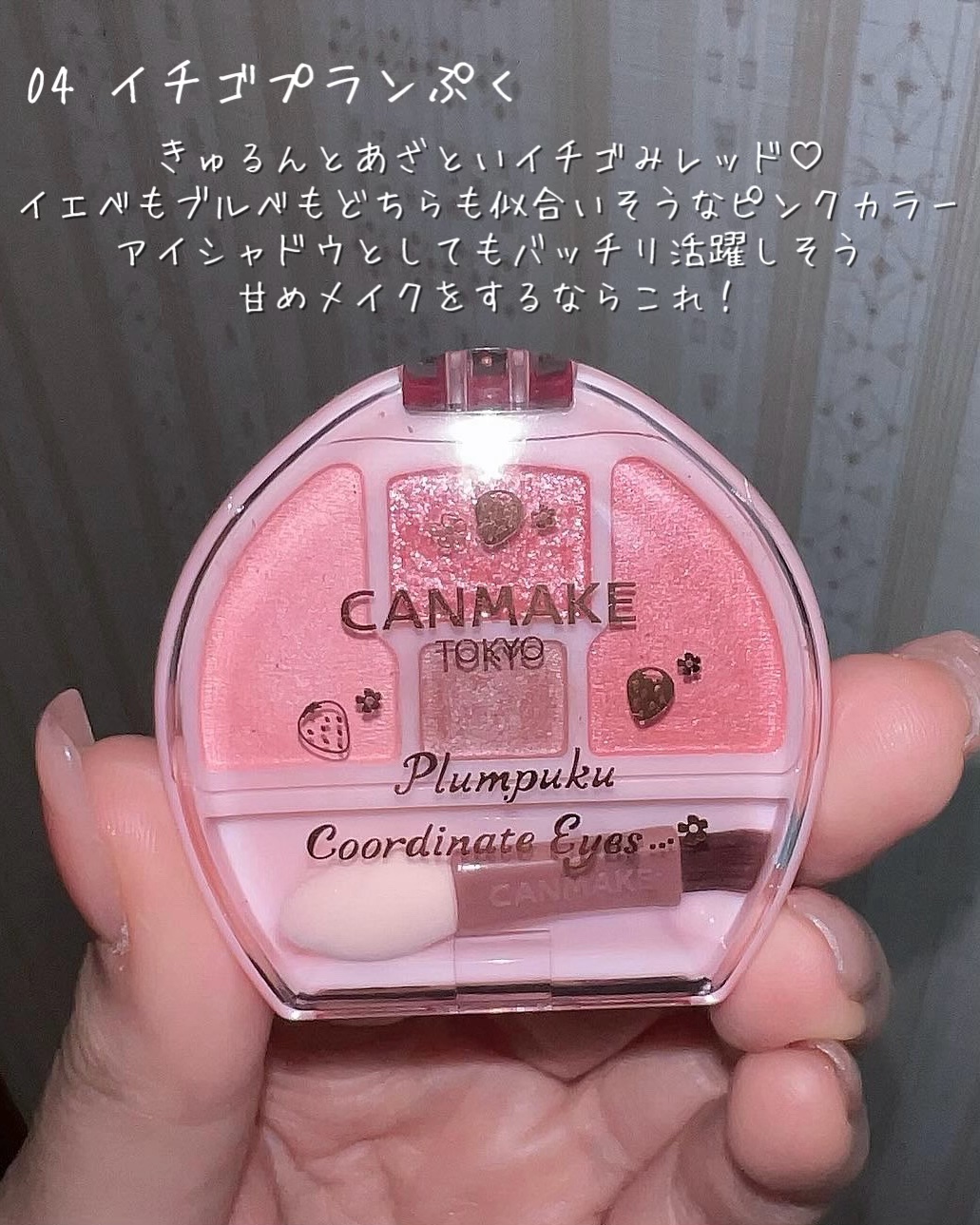 今日から数量限定で04イチゴプランぷくが登場しましたね🍓 それに合わせて全色まとめてレビューしてみました🙌 さらっとしつつもしっとりとした粉質 肌にふんわりと馴染みやすく、粉っぽくならないのが良き🍒◎ コンシーラーだと付けすぎてカピカピになっちゃったり…、アイシャドウだと濃くなったり、うまくプクっと感が出ないことがあるけど、これはそんな悩みを解決できるコスメでした!!🙌