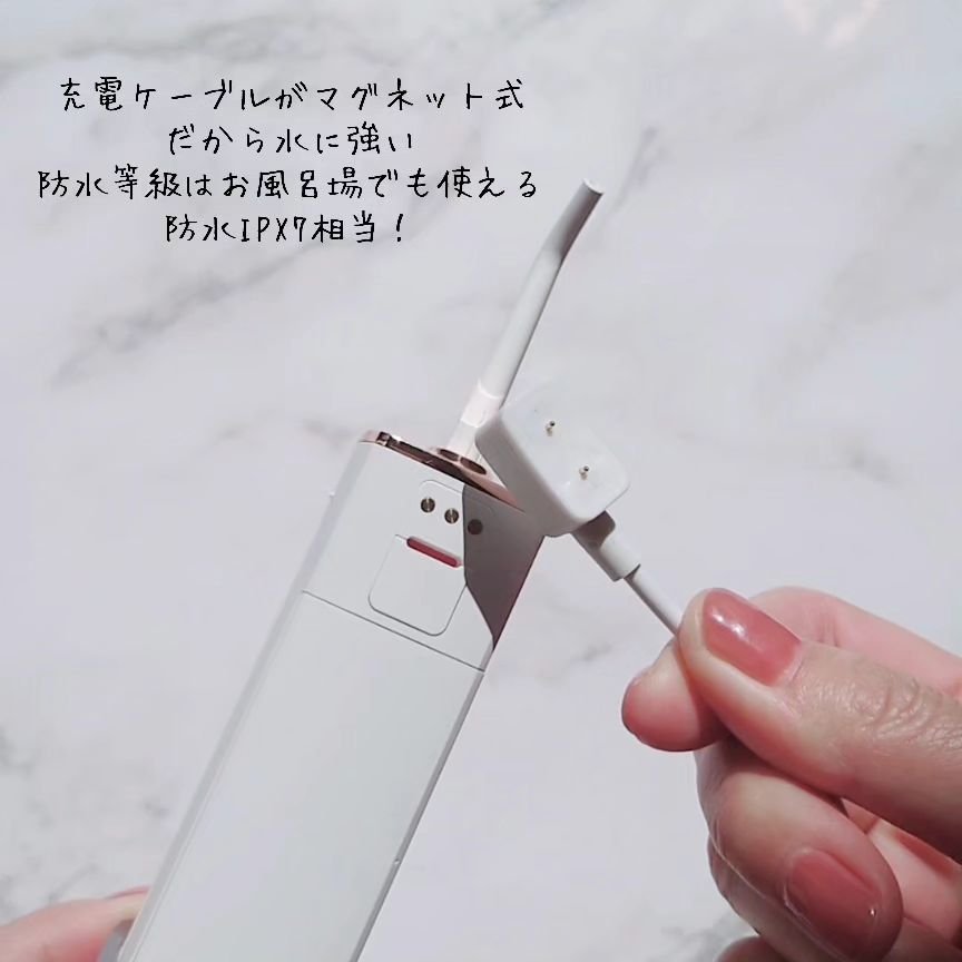 持ち運び簡単♪ メイクポーチにも収まるコンパクト設計✨ お口のエステ、ウォーターフロッサー、使ってみました。 見た目がスタイリッシュ! 一見ウォーターフロッサーに見えないくらいかわいい。 ほどよい水流が歯周ポケットに届いてきもちいい✨ フロスでも感じられないすっきり感がウォーターフロッサーのいいところ。