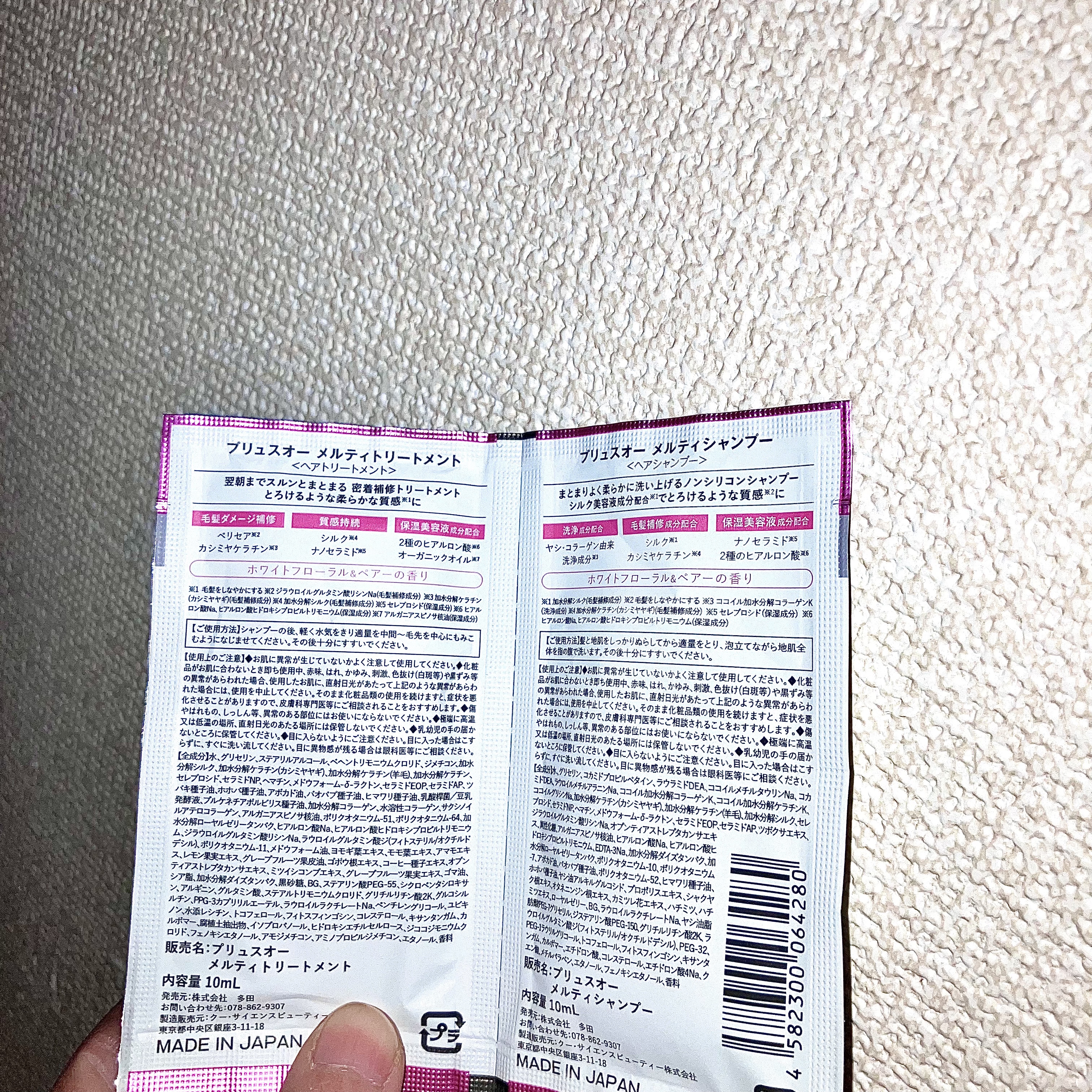 - <メルティシャンプー> 水、グリセリン、コカミドプロピルベタイン、ラウラミドDEA、ココイルメチルタウリンNa、コカミドDEA、ラウロイルメチルアラニンNa、ココイル加水分解コラーゲンK、ココイル加水分解ケラチンK、ココイルグリシンNa、加水分解ケラチン(カシミヤヤギ)、加水分解ケラチン(羊毛)、加水分解シルク、セレブロシド、セラミドNP、ヘマチン、メドウフォーム-δ-ラクトン、セラミドEOP、セラミドAP、ツボクサエキス、ジラウロイルグルタミン酸リシンNa、オプンティアストレプタカンサエキス、異性化糖、アルガニアスピノサ核油、ヒアルロン酸Na、ヒアルロン酸ヒドロキシプロピルトリモニウム、EDTA-3Na、加水分解ダイズタンパク、加水分解ローヤルゼリータンパク、ポリクオタニウム-10、ポリクオタニウム-7、アボカド油、バオバブ種子油、ポリクオタニウム-52、ヒマワリ種子油、ホホバ種子油、ヤシ油アルキルグルコシド、プロポリスエキス、シャクヤク根エキス、オタネニンジン根エキス、カミツレ花エキス、ハチミツ、ハチミツエキス、ローヤルゼリー、BG、ラウロイルラクチレートNa、ヤシ油脂肪酸PEG-7グリセリル、ジステアリン酸PEG-150、グリチルリチン酸2K、ラウロイルグルタミン酸ジ(フィトステリル/オクチルドデシル)、PEG-32、PEG-1ラウリルグリコール、トコフェロール、フィトスフィンゴシン、キサンタンガム、カルボマー、エチドロン酸、コレステロール、エチドロン酸4Na、クエン酸、メチルパラベン、エタノール、フェノキシエタノール、香料 <メルティトリートメント> 水、グリセリン、ステアリルアルコール、ベヘントリモニウムクロリド、ジメチコン、加水分解シルク、加水分解ケラチン(カシミヤヤギ)、加水分解ケラチン(羊毛)、加水分解ケラチン、セレブロシド、セラミドNP、ヘマチン、メドウフォーム-δ-ラクトン、セラミドEOP、セラミドAP、ツバキ種子油、ホホバ種子油、アボカド油、バオバブ種子油、ヒマワリ種子油、乳酸桿菌/豆乳発酵液、プルケネチアボルビリス種子油、加水分解コラーゲン、水溶性コラーゲン、サクシノイルアテロコラーゲン、アルガニアスピノサ核油、ポリクオタニウム-51、ポリクオタニウム-64、加水分解ローヤルゼリータンパク、ヒアルロン酸Na、ヒアルロン酸ヒドロキシプロピルトリモニウム、ジラウロイルグルタミン酸リシンNa、ラウロイルグルタミン酸ジ(フィトステリル/オクチルドデシル)、ポリクオタニウム-11、メドウフォーム油、ヨモギ葉エキス、モモ葉エキス、アマモエキス、レモン果実エキス、グレープフルーツ果皮油、ゴボウ根エキス、コーヒー種子エキス、オプンティアストレプタカンサエキス、ミツイシコンブエキス、グレープフルーツ果実エキス、ゴマ油、シア脂、加水分解ダイズタンパク、黒砂糖、BG、ステアリン酸PEG-55、シクロペンタシロキサン、アルギニン、グルタミン酸、ステアルトリモニウムクロリド、グリチルリチン酸2K、グルコシルルチン、PPG-3カプリリルエーテル、ラウロイルラクチレートNa、ペンチレングリコール、ユビキノン、水添レシチン、トコフェロール、フィトスフィンゴシン、コレステロール、キサンタンガム、カルボマー、腐植土抽出物、イソプロパノール、ヒドロキシエチルセルロース、ジココジモニウムクロリド、フェノキシエタノール、アモジメチコン、アミノプロピルジメチコン、エタノール、香料 <メルティシャンプー詰替> 水、グリセリン、コカミドプロピルベタイン、ラウラミドDEA、ココイルメチルタウリンNa、コカミドDEA、ラウロイルメチルアラニンNa、ココイル加水分解コラーゲンK、ココイル加水分解ケラチンK、ココイルグリシンNa、加水分解ケラチン(カシミヤヤギ)、加水分解ケラチン(羊毛)、加水分解シルク、セレブロシド、セラミドNP、ヘマチン、メドウフォーム-δ-ラクトン、セラミドEOP、セラミドAP、ツボクサエキス、ジラウロイルグルタミン酸リシンNa、オプンティアストレプタカンサエキス、異性化糖、アルガニアスピノサ核油、ヒアルロン酸Na、ヒアルロン酸ヒドロキシプロピルトリモニウム、EDTA-3Na、加水分解ダイズタンパク、加水分解ローヤルゼリータンパク、ポリクオタニウム-10、ポリクオタニウム-7、アボカド油、バオバブ種子油、ポリクオタニウム-52、ヒマワリ種子油、ホホバ種子油、ヤシ油アルキルグルコシド、プロポリスエキス、シャクヤク根エキス、オタネニンジン根エキス、カミツレ花エキス、ハチミツ、ハチミツエキス、ローヤルゼリー、BG、ラウロイルラクチレートNa、ヤシ油脂肪酸PEG-7グリセリル、ジステアリン酸PEG-150、グリチルリチン酸2K、ラウロイルグルタミン酸ジ(フィトステリル/オクチルドデシル)、PEG-32、PEG-1ラウリルグリコール、トコフェロール、フィトスフィンゴシン、キサンタンガム、カルボマー、エチドロン酸、コレステロール、エチドロン酸4Na、クエン酸、メチルパラベン、エタノール、フェノキシエタノール、香料 <メルティトリートメント詰