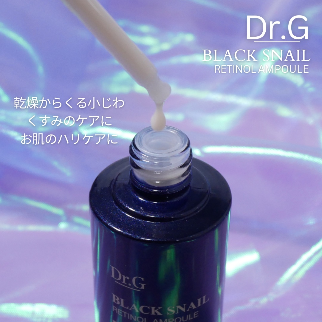 - ブラックスネイル*とレチノール*を配合した、若々しい肌印象に導く美容液です。 Dr.Gのレチノールは独自の成分である、ブラックスネイルレチノール*を使っています! 肌に高い保湿感を与え、肌のキメを整え、弾力やハリのケアを助けるだけでなく、肌の乾燥くすみをケアし、明るい印象のぷるんっとハリのある肌に導きます。 *整肌成分