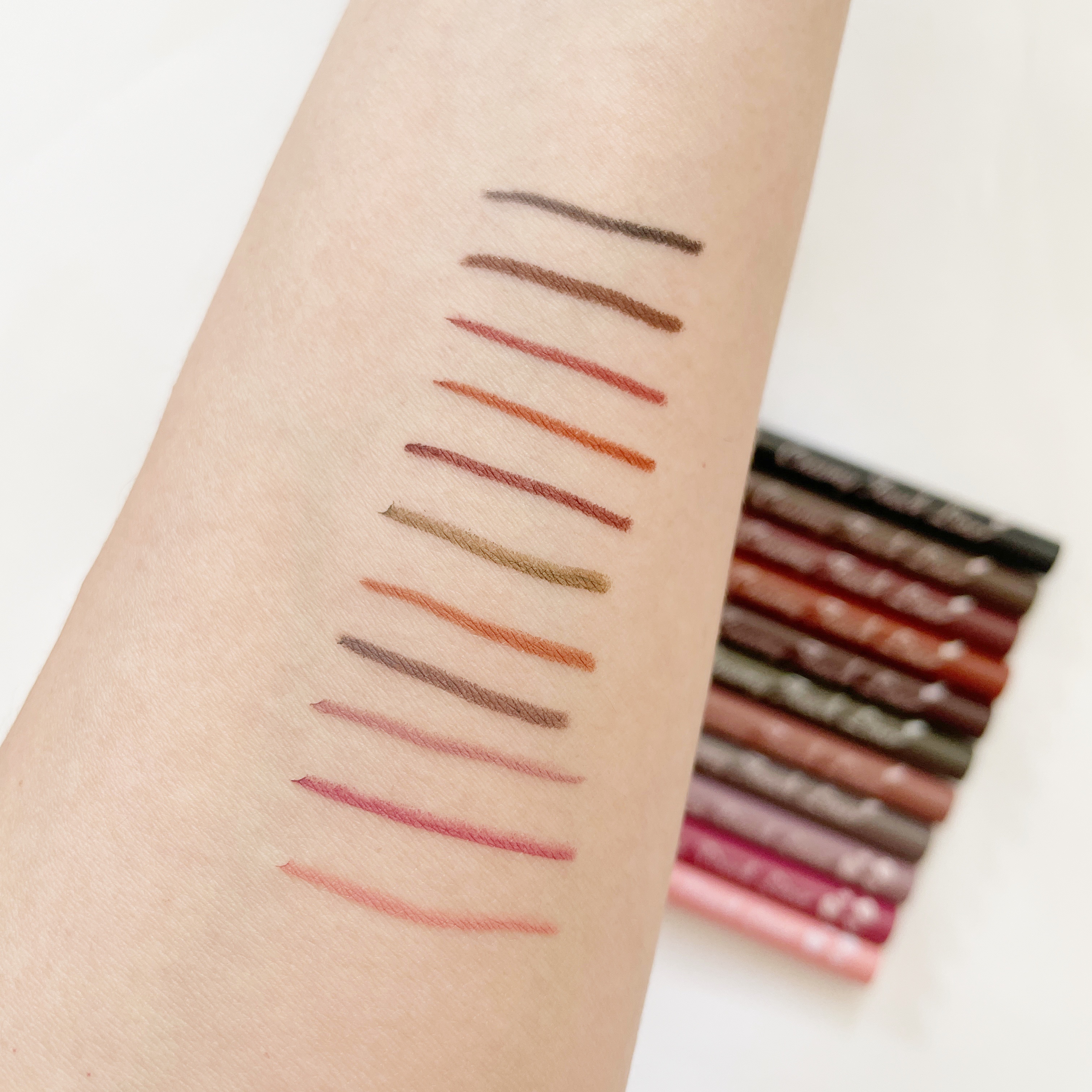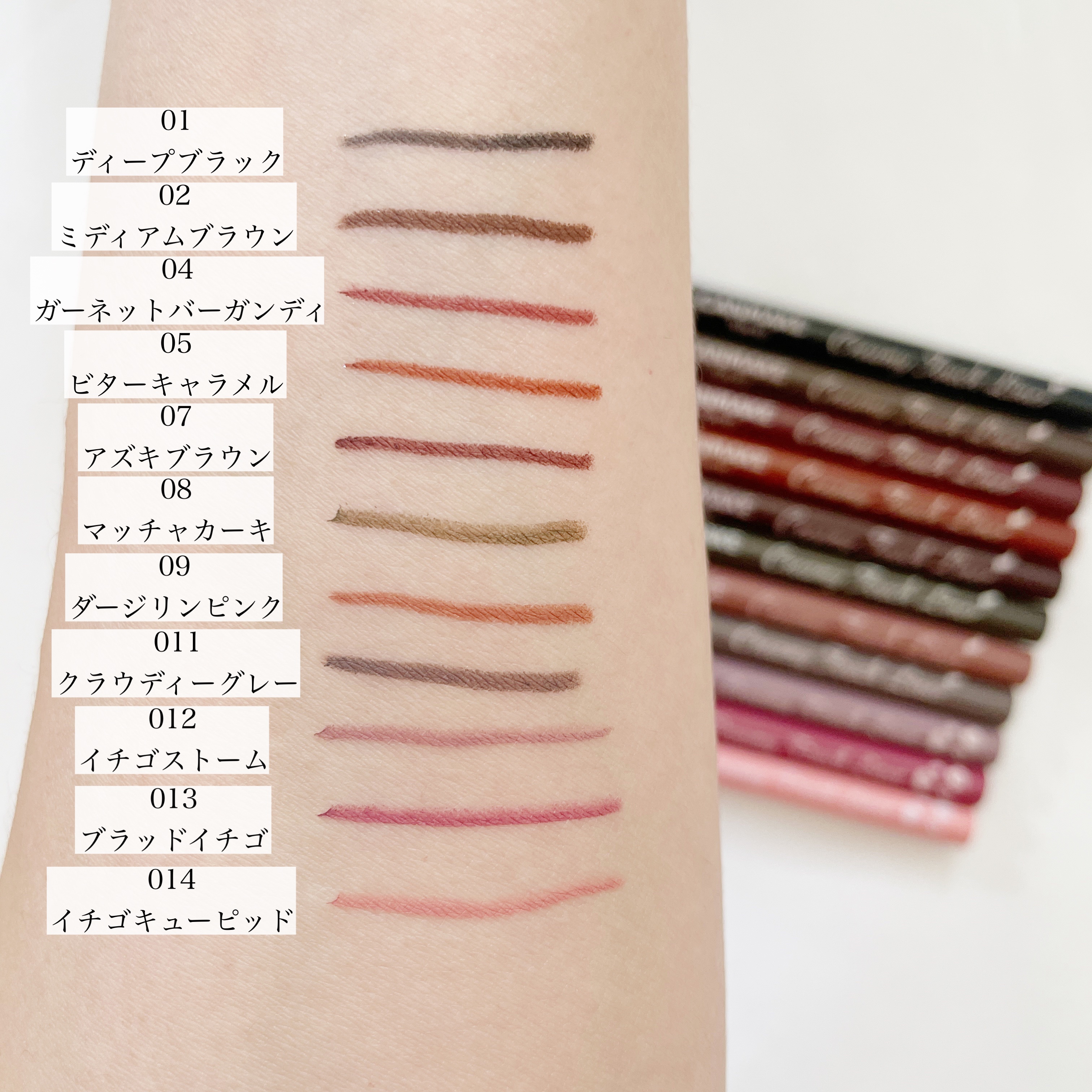 ピンク系が多いなと思ったので ピンクだけのスウォッチも最後に載せてるよ🌸 10.12.13.14は限定です❤️🩹 ♡01/ディープブラック ♡02/ミディアムブラウン ♡03/ダークブラウン ♡04/ガーネットバーガンディ ♡05/ビターキャラメル ♡06/フォギープラム ♡07/アズキブラウン ♡08/マッチャカーキ ♡09/ダージリンピンク ♡10/ココアグレージュ(限定) ♡11/クラウディーグレー ♡12/イチゴストーム(限定) ♡13/ブラッドイチゴ(限定) ♡14/イチゴキューピッド(限定)