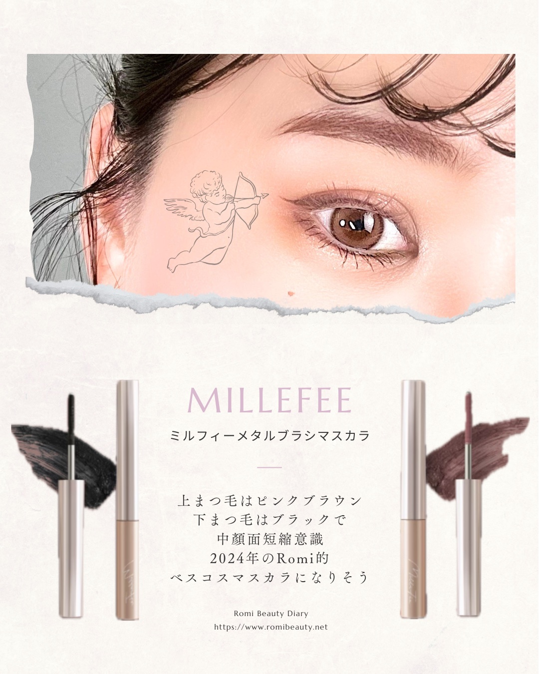- 360°メタルブラシでまつげの毛流れを整えて、束感まつげを簡単メイク! 自まつげが伸びたように自然にロング&ボリュームアップし、美しい上向きまつげを長時間キープ! <メタルブラシで、長時間続く解けない魔法> ロングエクステファイバー配合でまるで長い自まつ毛のような仕上がり。 水・汗・こすれに強く、キープ力が持続して時間が経っても可愛い目元に。 ■メタルブラシのポイント 360°のメタルブラシに均一にマスカラ液が付く、MilleFéeのこだわり設計。 そのためまつ毛に塗りやすく、ダマになりにくく綺麗なセパレートまつ毛が簡単に完成します。 またマスカラ液にはファイバーを配合し、自然で長いまつ毛に見せてくれる効果も。