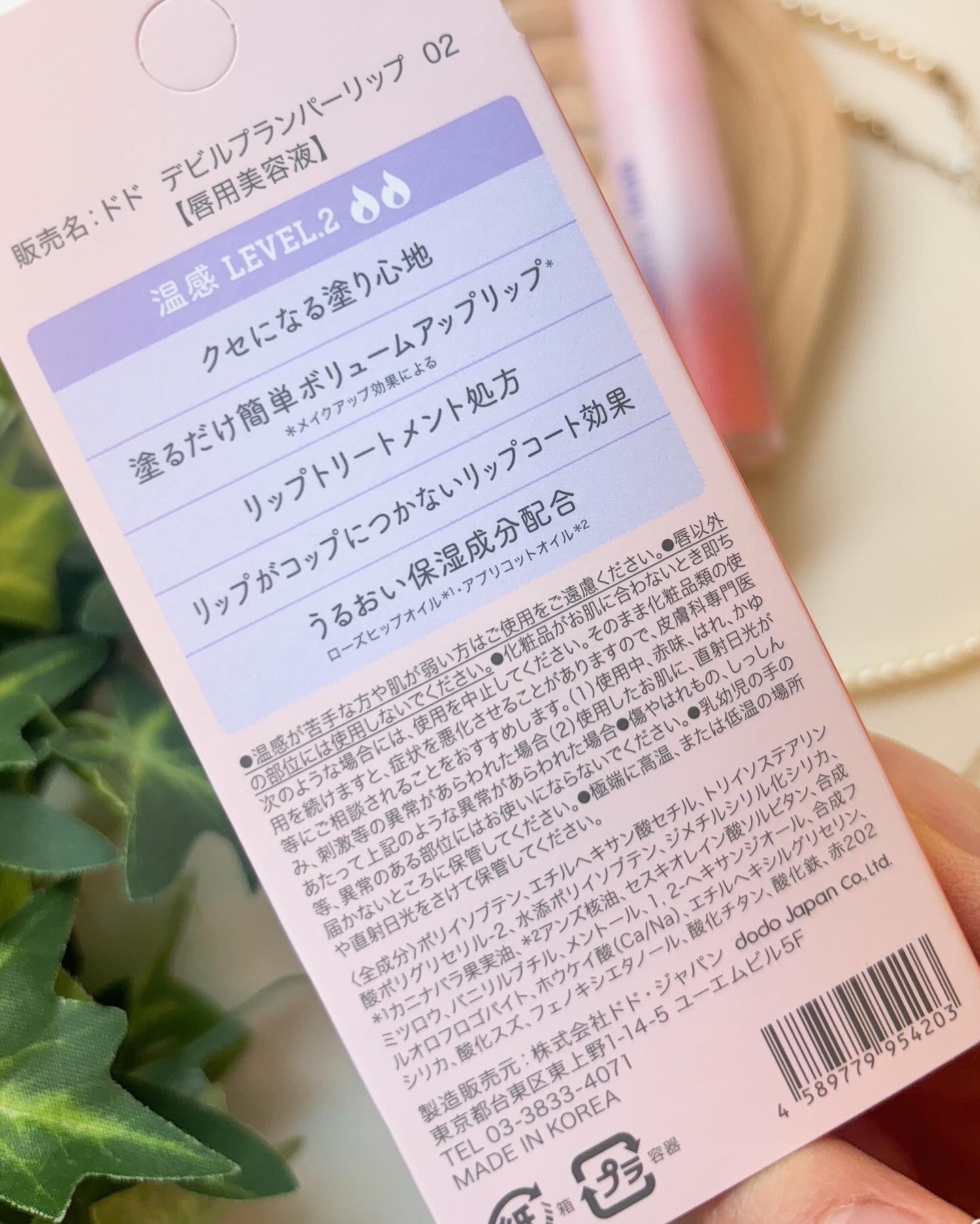 - 韓国でも大人気、塗るだけでぷっくりとしたとした厚みとハリ感を演出するプランパーリップ。 ドドのデビルプランパーリップは、くちびるにむっちりとしたハリ感を与えつつ、クセになるバニリルブチルでジンジンする温感を、メントールでスースーする爽快感を与えます。 レベルが3段階にわかれており、初心者向けから上級者向けの刺激感を与えて楽しめます。 オリジナル水分膜処方で、唇をしっかりコーティングしてくれて、コップへの色うつりも防ぎます。 手持ちのリップの上からの使用も可能で、リップコートとしても使用できます。
