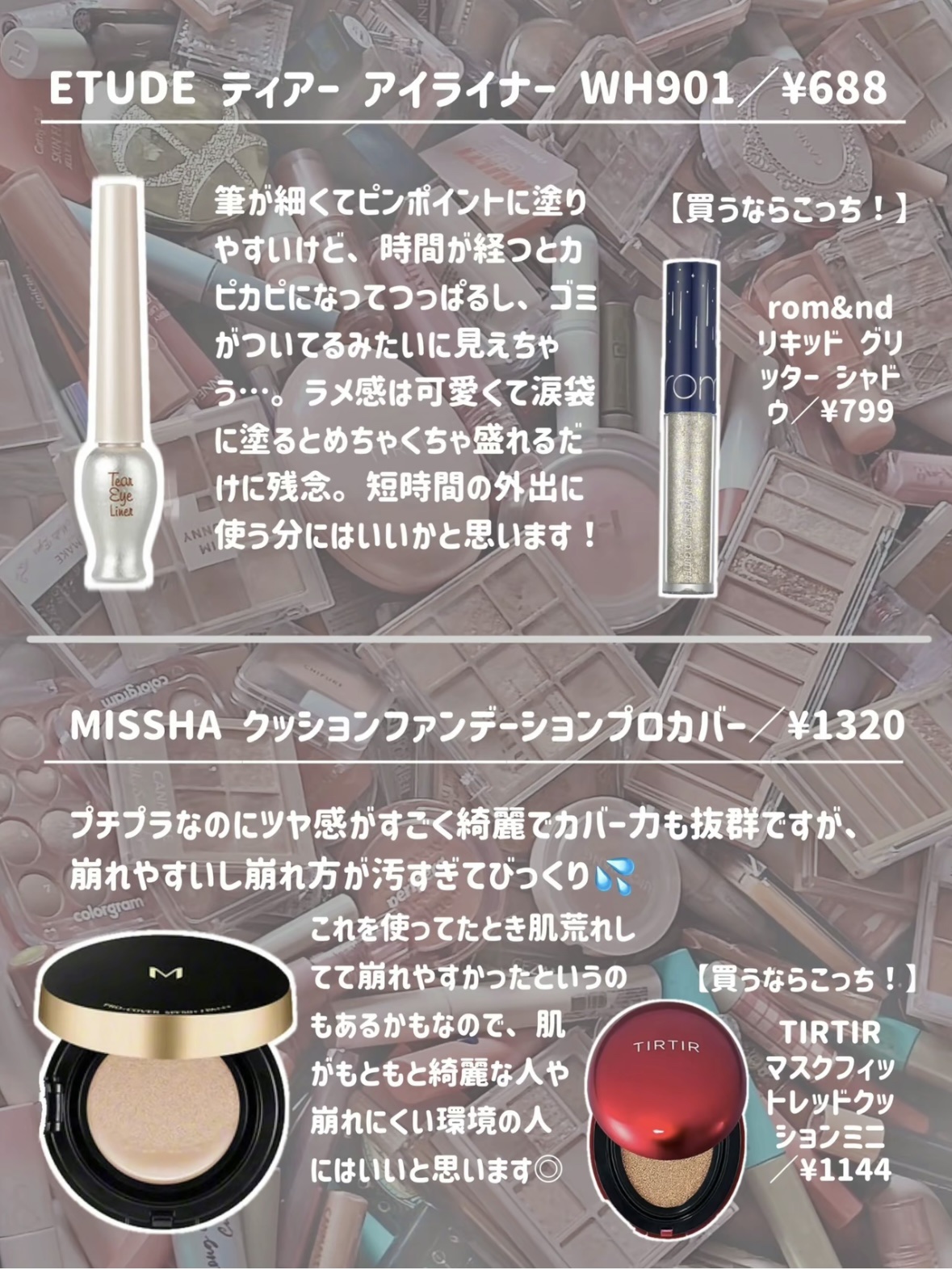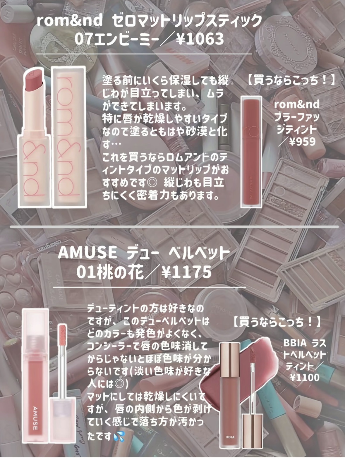 ロムアンドのティントは久しぶりの購入でリニューアルしてました。相変わらず香りが良い。新色の可愛いピーチピンク購入しました。 TIRTIRのリッププランパーは刺激優しめです。リップアディクトくらいかな?香りも良いです。ガムシロくらいのテクスチャでラメ控えめのツヤツヤが使いやすい。