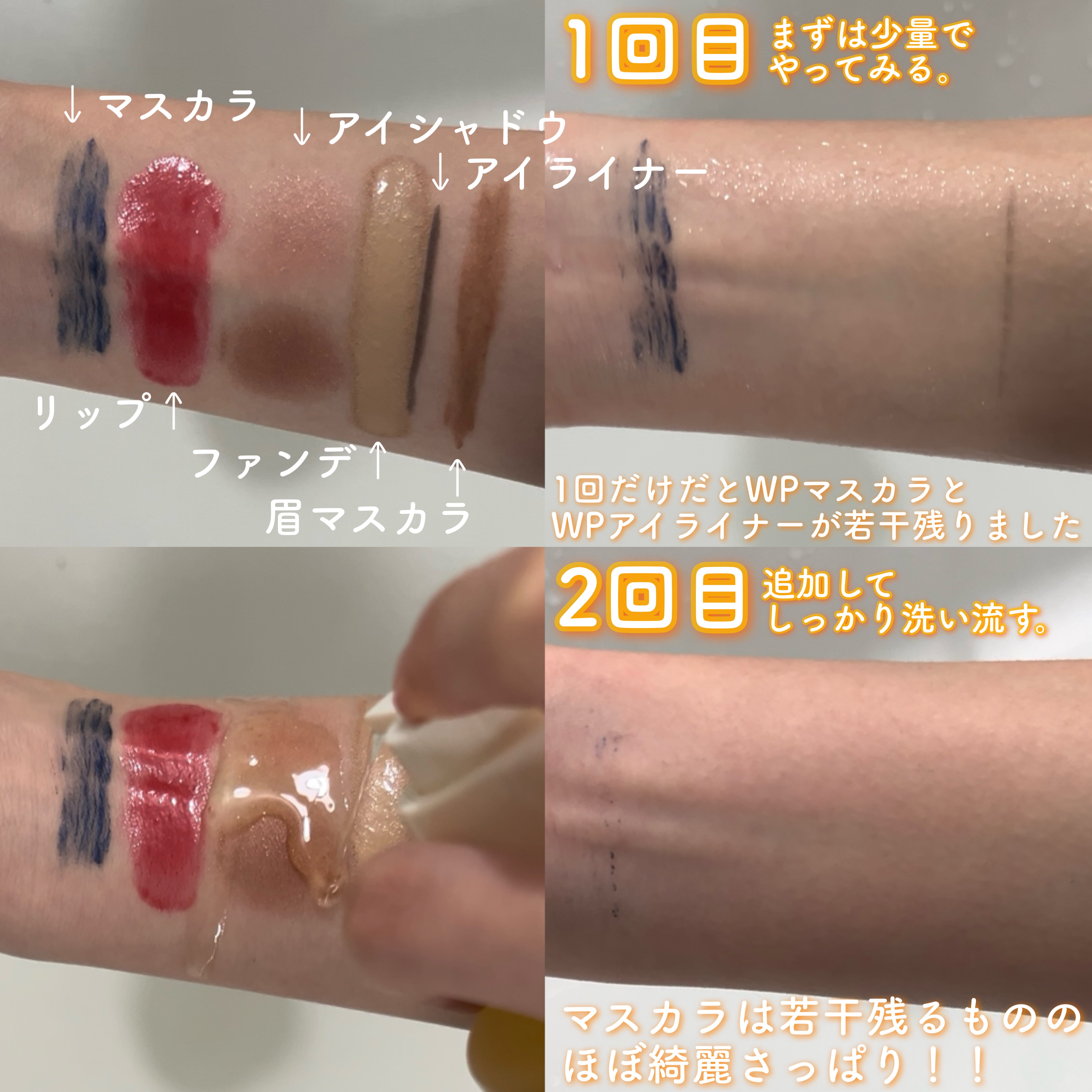 使用感としては、洗い上がりはさっぱりとしていて、お肌がすべすべな質感になったように感じました! メイク落ち度合いや、お肌が突っ張りにくい点から、洗浄力はかなりマイルドで、お肌に優しいのではないかなと感じました。(個人の意見です。) wpのマスカラやアイライナーを使う方はダブル洗顔はした方が良いところ。