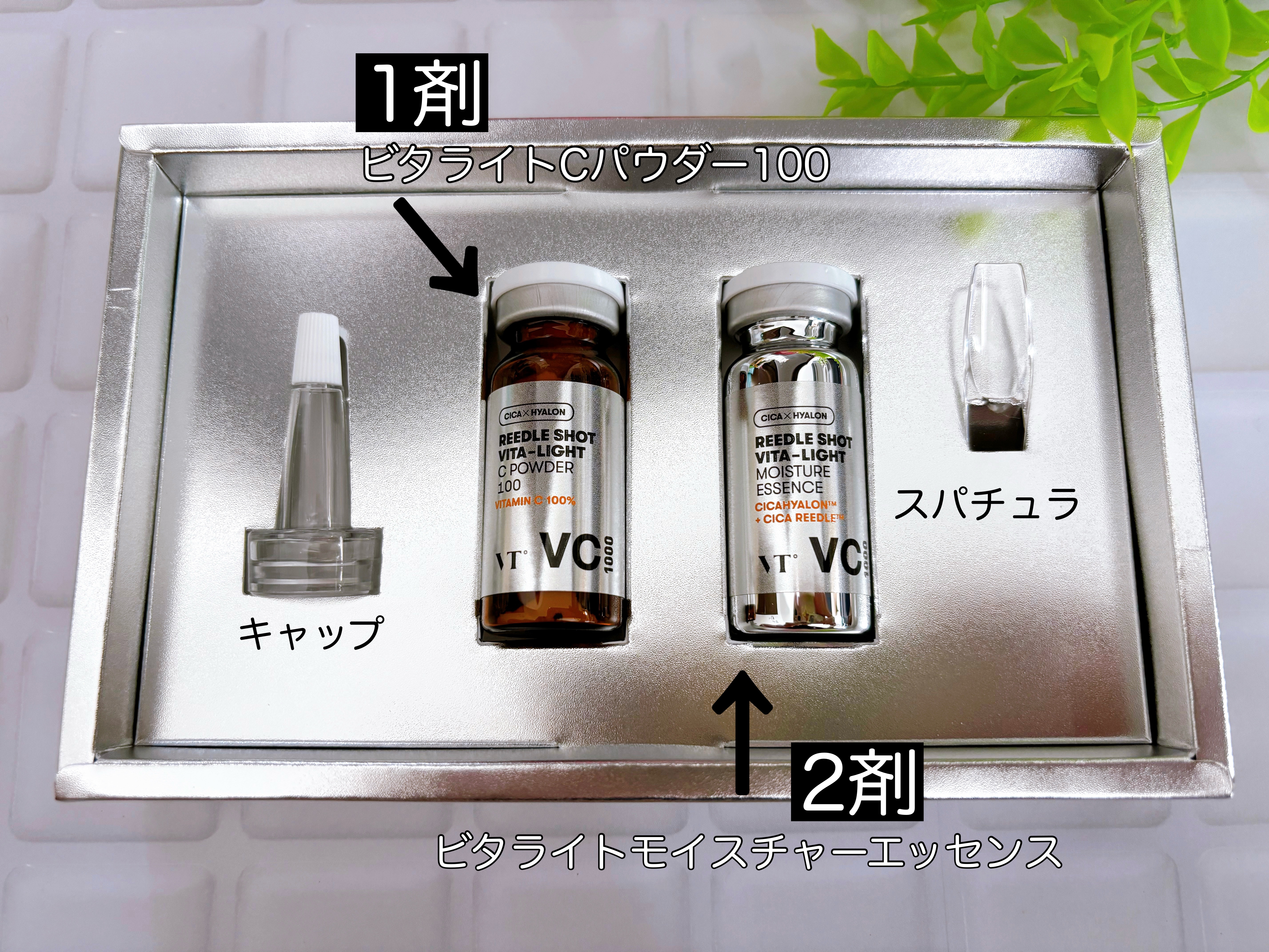 VTリードルショット100リードルショットビタライトCエッセンスパウダーと液体を混ぜて作る2液型のフレッシュなビタミンC美容液🍋1週間くらいで使い切れる小さいサイズで新鮮なまま使い切れるし、2液型だから混ぜるのも実験みたいで楽しい定番人気のリ...