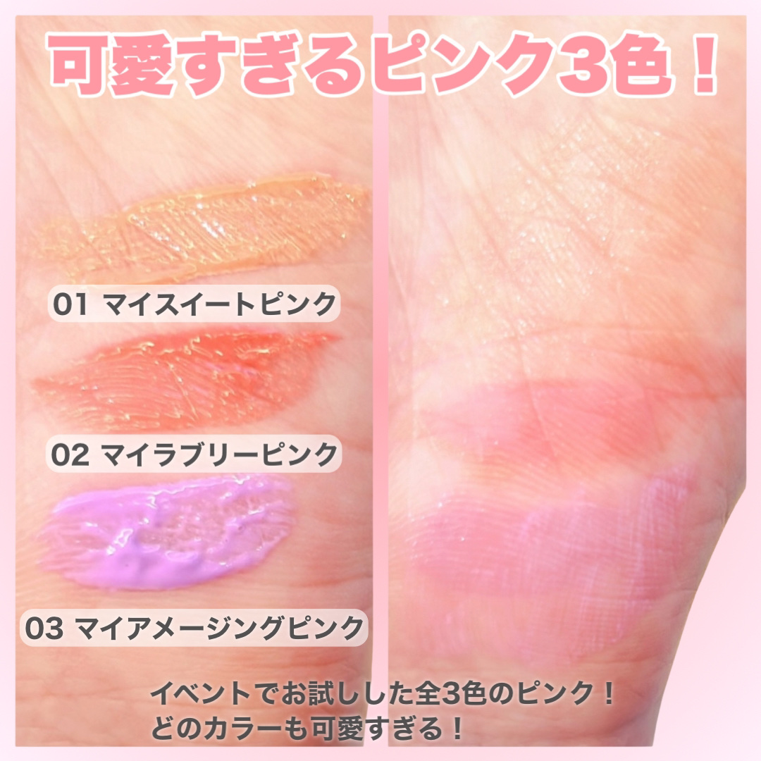 - <01 マイスイートピンク> 水、グリセリン、水添ポリイソブテン、BG、トリイソステアリン酸ポリグリセリル-2、プロパンジオール、酸化チタン、(アクリル酸Na/アクリロイルジメチルタウリンNa)コポリマー、1,2-ヘキサンジオール、ポリソルベート60、イソヘキサデカン、ビサボロール、酸化鉄、ポリソルベート80、エチルヘキシルグリセリン、オレイン酸ソルビタン、ポリアクリル酸アンモニウム、水酸化Al、(PEG-240/デシルテトラデセス-20/HDI)コポリマー、アデノシン、フェノキシエタノール、赤227、アンズ核油、月見草油、ツバキ種子油、センチフォリアバラ花エキス、ポリアクリレートクロスポリマー-6、ラウリン酸K、トコフェロール <02 マイラブリーピンク> 水、グリセリン、水添ポリイソブテン、BG、トリイソステアリン酸ポリグリセリル-2、プロパンジオール、(アクリル酸Na/アクリロイルジメチルタウリンNa)コポリマー、ポリソルベート80、1,2-ヘキサンジオール、酸化チタン、イソヘキサデカン、ビサボロール、酸化鉄、エチルヘキシルグリセリン、オレイン酸ソルビタン、(PEG-240/デシルテトラデセス-20/HDI)コポリマー、アデノシン、ポリアクリル酸アンモニウム、水酸化Al、赤227、フェノキシエタノール、月見草油、ツバキ種子油、アンズ核油、センチフォリアバラ花エキス、黄4、ポリアクリレートクロスポリマー-6、ラウリン酸K、トコフェロール、青1 <03 マイアメージングピンク> 水、グリセリン、水添ポリイソブテン、BG、トリイソステアリン酸ポリグリセリル-2、プロパンジオール、(アクリル酸Na/アクリロイルジメチルタウリンNa)コポリマー、ポリソルベート80、1,2-ヘキサンジオール、イソヘキサデカン、酸化チタン、ビサボロール、エチルヘキシルグリセリン、オレイン酸ソルビタン、(PEG-240/デシルテトラデセス-20/HDI)コポリマー、アデノシン、水酸化Al、ポリアクリル酸アンモニウム、赤104(1)、赤227、フェノキシエタノール、青1、ツバキ種子油、月見草油、アンズ核油、センチフォリアバラ花エキス、ポリアクリレートクロスポリマー-6、ラウリン酸K、トコフェロール