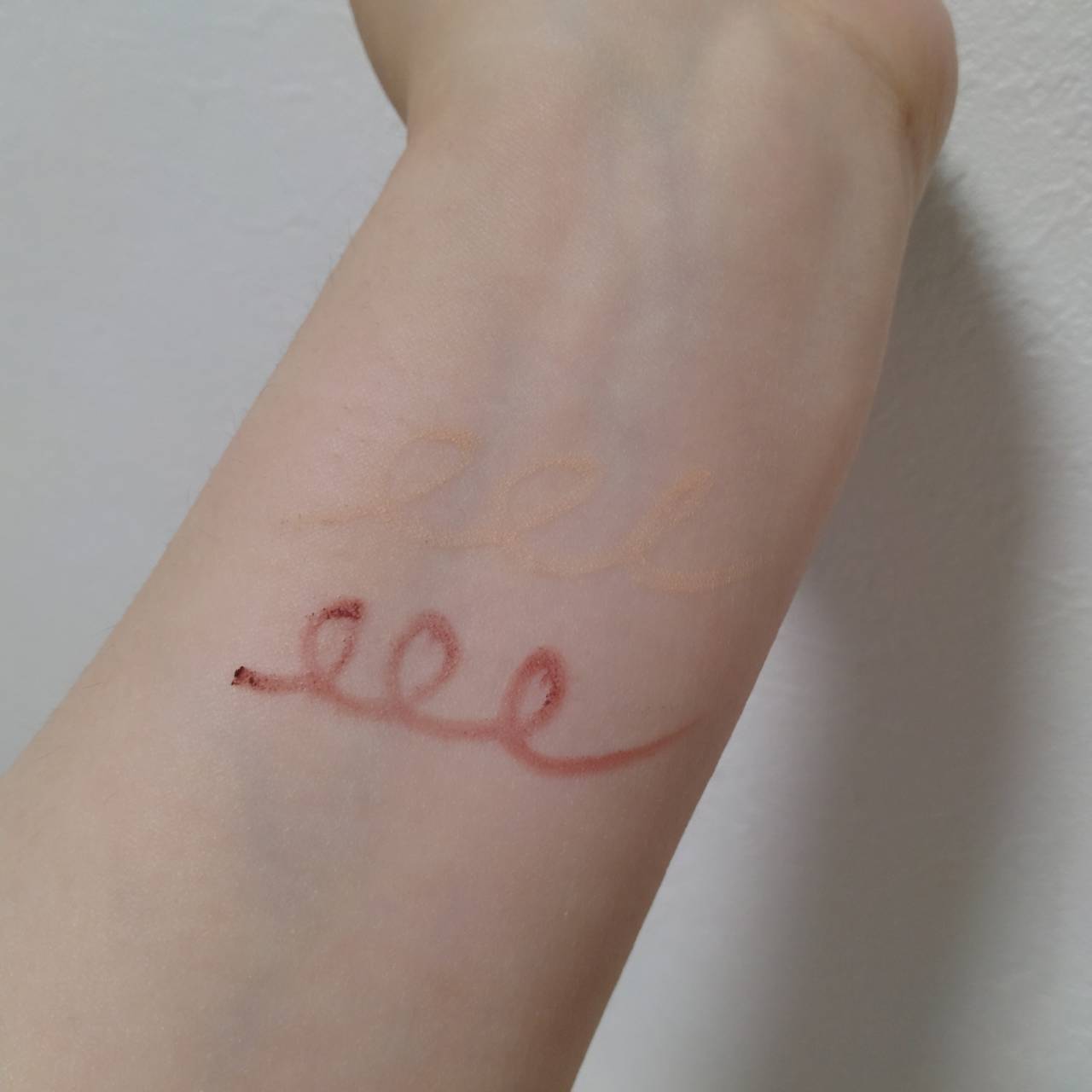 #えりぃのスウォッチです。#ロムアンド#romand#ジュシーラスティングティント22ポメロスキンピンクベージュカラーです。ベージュの中にピンク味があるので、血色感が感じられます。ベースリップとしても!23ヌカダミアポメロスキンより赤みがあり...