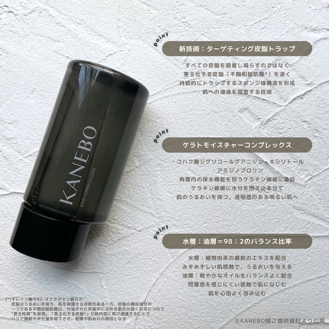 \皮脂ケア万人受け化粧水/KANEBOスキンハーモナイザーミニサイズ38ml¥1210(税込み)〜4つのポイント〜①「悪玉化する皮脂*」をトラップ 乾燥や肌あれへの新たな**アプローチ *不飽和脂肪酸 (オレイン酸や8Z-オクタデセン酸など)...