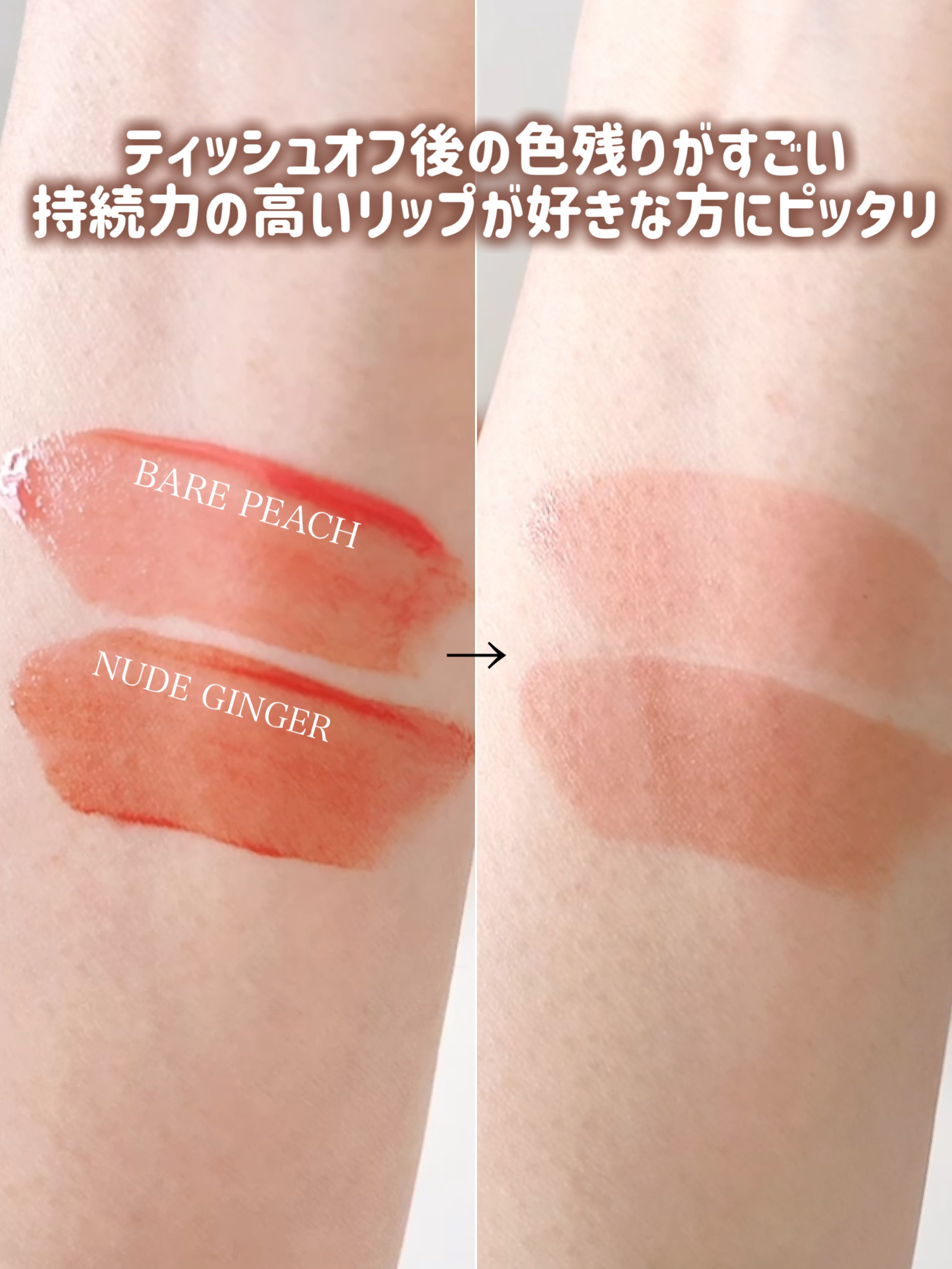 - <01 ベアピーチ(Bare Peach)> 水、ジフェニルジメチコン、ジイソステアリルマレート、ビス-ジグリセリルポリアシルアジペート-2、ビス-ベヘニル/イソステアリル/フィトステリルダイマーダイリノレイルダイマー、水素添加ポリイソブチレン、ジグリセリン、ジプロピレングリコール、セチルPEG/PPG-10/1ジメチコン、ソルビタンイソステアレート、ポリソルベート60、ペンチレングリコール、オクチルドデカノール、酸化チタン (CI 77891)、セテアレツ-20、ヒドロキシエチルアクリレート/ナトリウムアクリロイルジメチルタウレート共重合体、フェノキシエタノール、スクワラン、ステビオシド、香料、イエロー5 (CI 19140)、エチルヘキシルグリセリン、イエロー6 (CI 15985)、レッド33 (CI 17200)、水酸化アルミニウム、アンモニウムポリアクリレート、ブチレングリコール、ブルー1 (CI 42090)、ペンタエリスリチルテトラ-ジ-t-ブチルヒドロキシヒドロシンナメート <02 リッチサーモン(Rich Salmon)> 水、ジフェニルジメチコン、ジイソステアリルマレート、ビス-ジグリセリルポリアシルアジペート-2、ビス-ベヘニル/イソステアリル/フィトステリルダイマーダイリノレイルダイマー、水素添加ポリイソブチレン、ジグリセリン、ジプロピレングリコール、セチルPEG/PPG-10/1ジメチコン、ソルビタンイソステアレート、ポリソルベート60、ペンチレングリコール、オクチルドデカノール、酸化チタン (CI 77891)、セテアレツ-20、ヒドロキシエチルアクリレート/ナトリウムアクリロイルジメチルタウレート共重合体、フェノキシエタノール、スクワラン、ステビオシド、イエロー6 (CI 15985)、レッド33 (CI 17200)、香料、エチルヘキシルグリセリン、水酸化アルミニウム、アンモニウムポリアクリレート、イエロー5 (CI 19140)、ブチレングリコール、ペンタエリスリチルテトラ-ジ-t-ブチルヒドロキシヒドロシンナメート <03 ロージーローズ(Rosy Rose)> 水、ジフェニルジメチコン、ジイソステアリルマレート、ビス-ジグリセリルポリアシルアジペート-2、ビス-ベヘニル/イソステアリル/フィトステリルダイマーダイリノレイルダイマー、水素添加ポリイソブチレン、ジグリセリン、ジプロピレングリコール、セチルPEG/PPG-10/1ジメチコン、ソルビタンイソステアレート、ポリソルベート60、ペンチレングリコール、オクチルドデカノール、セテアレツ-20、酸化チタン (CI 77891)、ヒドロキシエチルアクリレート/ナトリウムアクリロイルジメチルタウレート共重合体、スクワラン、フェノキシエタノール、ステビオシド、イエロー5 (CI 19140)、レッド33 (CI 17200)、香料、エチルヘキシルグリセリン、レッド28 (CI 45410)、水酸化アルミニウム、アンモニウムポリアクリレート、ブチレングリコール、イエロー6 (CI 15985)、ブルー1 (CI 42090)、ペンタエリスリチルテトラ-ジ-t-ブチルヒドロキシヒドロシンナメート <04 クラッシュ(Crush)> 水、ジフェニルジメチコン、ジイソステアリルマレート、ビス-ジグリセリルポリアシルアジペート-2、ビス-ベヘニル/イソステアリル/フィトステリルダイマーダイリノレイルダイマー、水素添加ポリイソブチレン、ジグリセリン、セチルPEG/PPG-10/1ジメチコン、ジプロピレングリコール、ソルビタンイソステアレート、ポリソルベート60、ペンチレングリコール、オクチルドデカノール、酸化チタン (CI 77891)、セテアレツ-20、ヒドロキシエチルアクリレート/ナトリウムアクリロイルジメチルタウレート共重合体、スクワラン、フェノキシエタノール、ポリグリセリン-3、ステビオシド、香料、エチルヘキシルグリセリン、イエロー6 (CI 15985)、レッド33 (CI 17200)、レッド28 (CI 45410)、ブルー1 (CI 42090)、イエロー5 (CI 19140) <05 スプラッシュ(Splash)> 水、ジフェニルジメチコン、ジイソステアリルマレート、ビス-ジグリセリルポリアシルアジペート-2、ビス-ベヘニル/イソステアリル/フィトステリルダイマーダイリノレイルダイマー、水素添加ポリイソブチレン、ジグリセリン、セチルPEG/PPG-10/1ジメチコン、ジプロピレングリコール、ソルビタンイソステアレート、ポリソルベート60、ペンチレングリコール、オクチルドデカノール、酸化チタン (CI 77891)、セテアレツ-20、ヒドロキシエチルアクリレート/ナトリウムアクリロイルジメチルタウレート共重合体、スクワラン、フェノキシエタノール、ポリグリセリン-3、ステビオシド、香料、エチルヘキシルグリセリン、イエロー6 (CI 15985)、レッド33 (CI 17200)、イエロー5 (CI 19140)、ブルー1 (CI 42090) <06 ヌードジンジャー(Nude Ginger)> 水、ジフェニルジメチコン、ジイソステアリルマレート、ビス-ジグリセリルポリアシルアジペート-2、ビス-ベヘニル/イソステアリル/フィトステリルダイマーダイリノレイルダイマー、水素添加ポリイソブチレン、ジグリセリン、セチルPEG/PPG-10/1ジメチコン、ジプロピレングリコール、ソルビタンイソステアレート、ポリソルベート60、ペンチレングリコール、オクチルドデカノール、酸化チタン (CI 77891)、セテアレツ-20