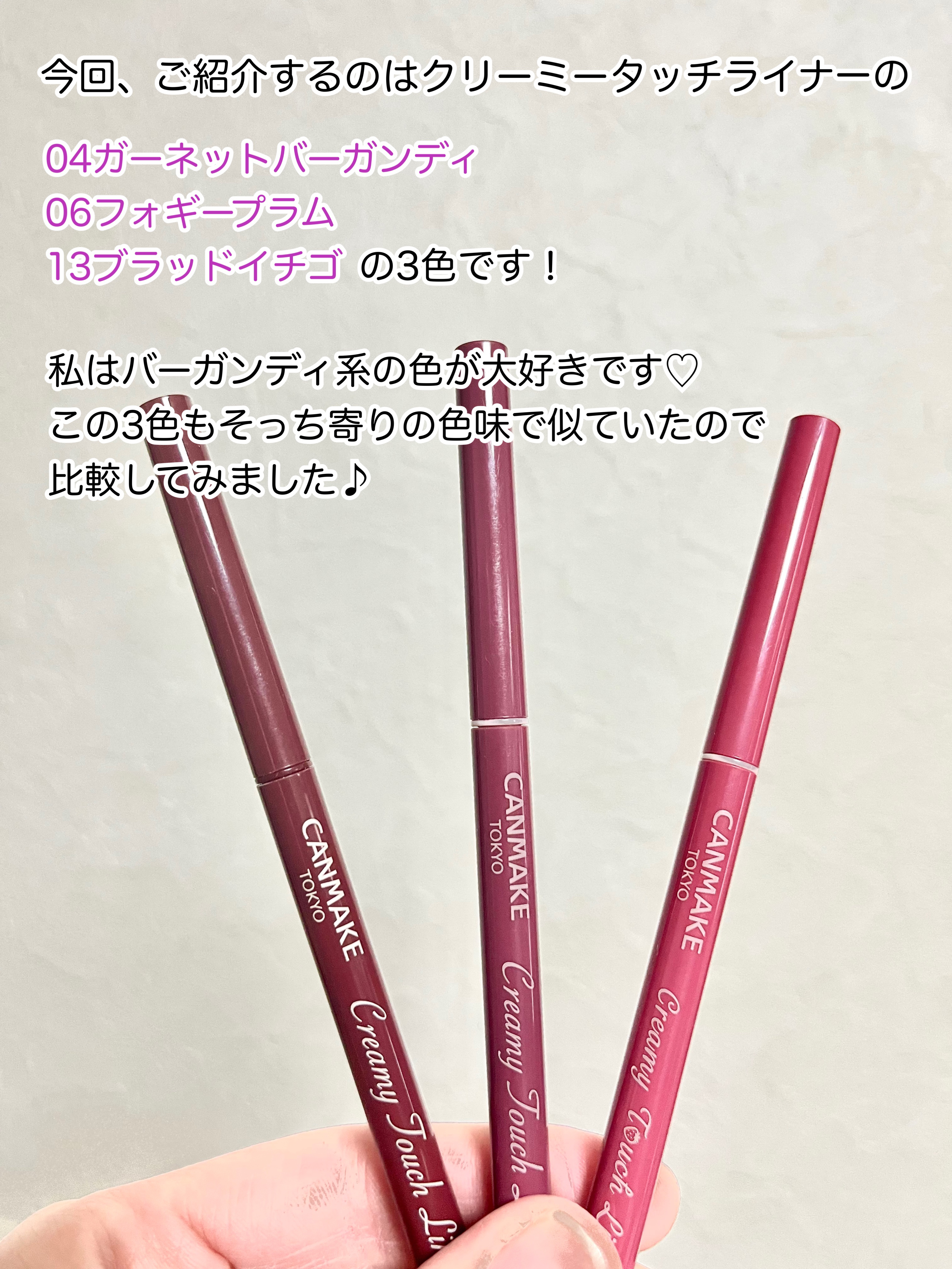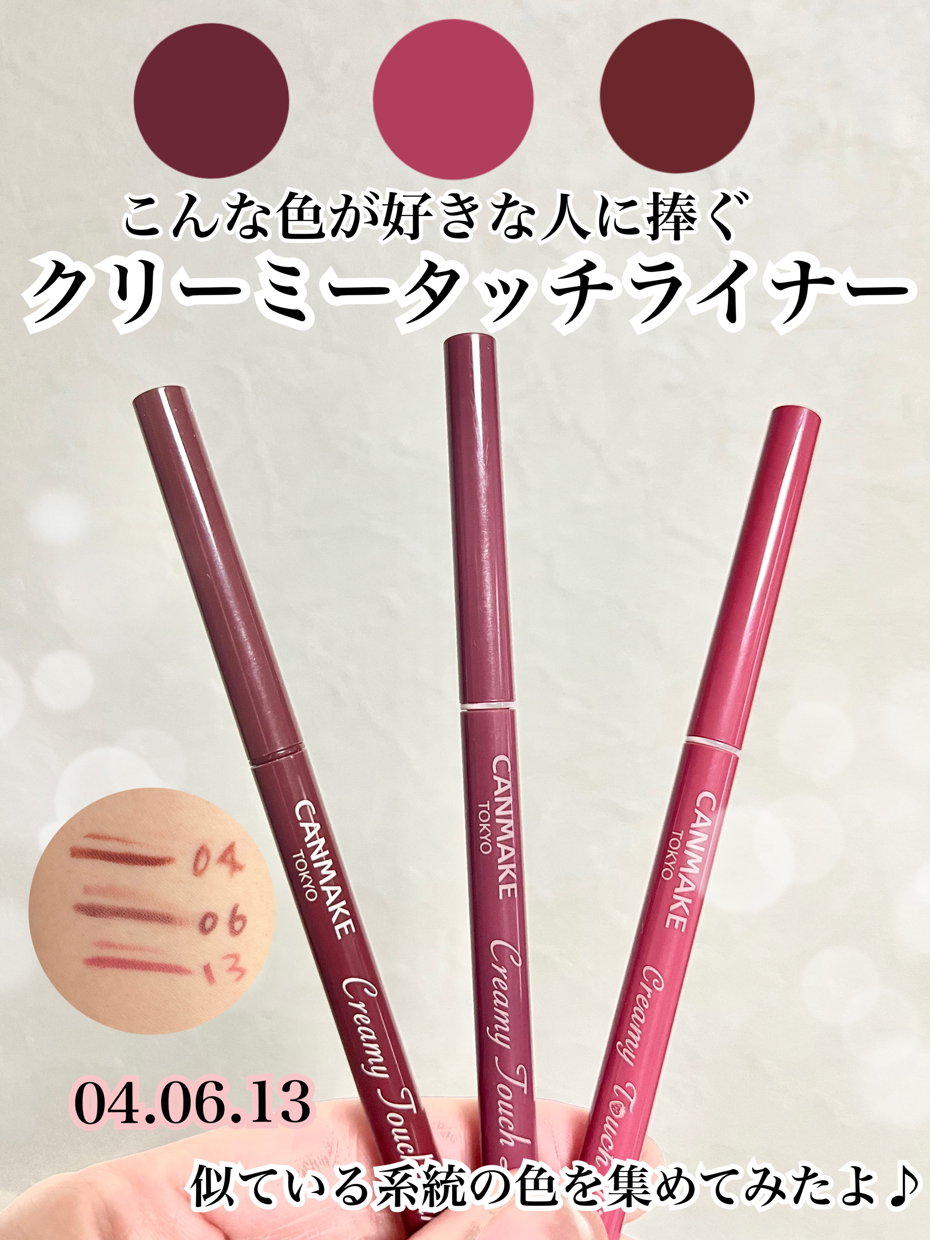 人気のCANMAKEクリーミータッチライナーから、私がよく使う3色をご紹介します💁🏻♀️ ボルドーメイクや赤系のメイクに活躍する大人っぽいバーガンディカラー💋 深めのレッドカラーなので、大人っぽいメイクにも使いやすくて良く使います🤫 今年の新色🧚🏻 本当の抹茶のような深いグリーンが、カーキメイクにも活躍しますし、オレンジメイクと合わせてもかわいいです😍