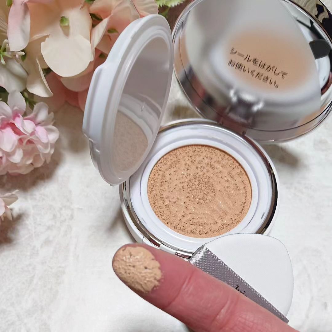 クッション部分はしっかりとファンデーションが染み込んでいて、触るとジュワッとするような感覚です。 ツヤ感のある綺麗な仕上がりで、カバー力もあるように思いますが厚塗り感がないのが嬉しいなと思います✨ 薄付きに仕上げられるのですが重ねても重たくならず、仕上がりがとにかく綺麗で肌への密着も良いように感じました。 付けていて肌への圧迫感も感じませんでしたし、使い心地も良くとても気に入りました😊
