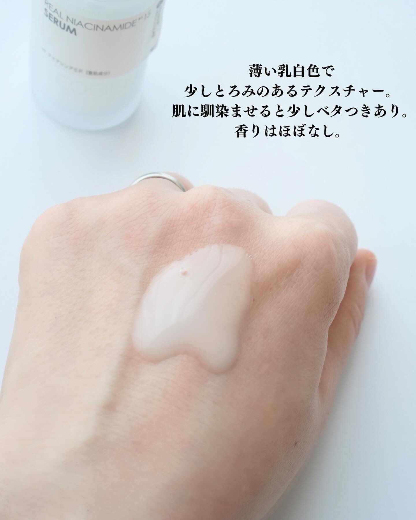 白くサラっと流れるようなテクスチャー 伸びやすく塗り心地もよい。スッと馴染んだらレチノール特有の香りやベタつきも少ない このセラム、めちゃくちゃ好きになりました。翌朝の肌がツルピカパン!これはリピ確定!