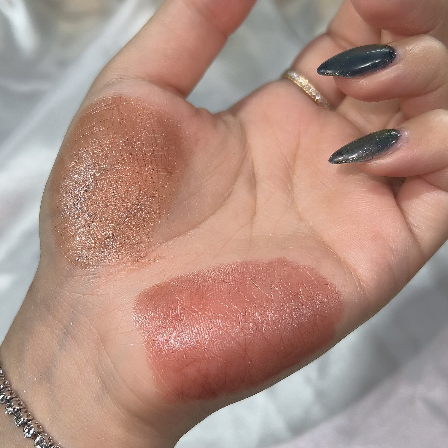 よくパレットのなかで明るいカラーをベースにまぶたに広く塗ることが多いのですが、パール感のあるカラーを避ける🙆♀️! パール感たっぷりの明るいカラーは涙袋に使うぐらい光を集めてぷっくり見せてくれるので、まぶたに広く使うと腫れぼったく見えがち😓 目元を明るくみせてくれたり、次に使うアイシャドウをぼかしやすくしてくれるけど、すっ飛ばしてメインのカラーを塗っちゃう✊🏻❤️🔥 涙袋にはたっぷり塗ってぷっくり見せる🙆♀️💕 シルキースフレアイズのマットタイプはすごく優れているな〜と感じました☺️💗 赤やオレンジなどは、入れすぎると腫れぼったく見えやすいので、見せたいカラーは下まぶた目尻にのせて色をたのしむ♡♡ パール感なしの透けマットだけじゃ物足りない… そう感じさせない華やかなラメが左上に入っているので黒目上と涙袋にのせるとすごく可愛い仕上がりに😍! 厄介な左右差のお陰でマットアイシャドウが好きになりました😌💕