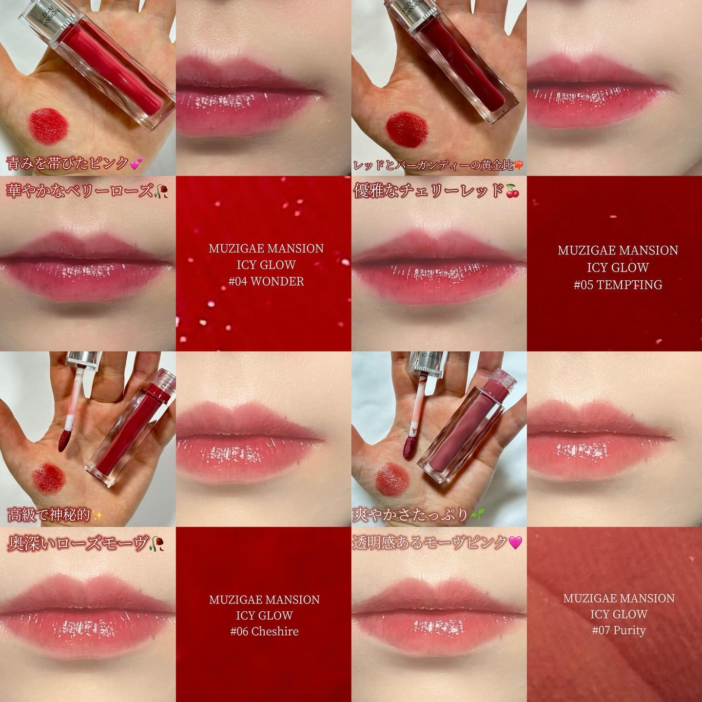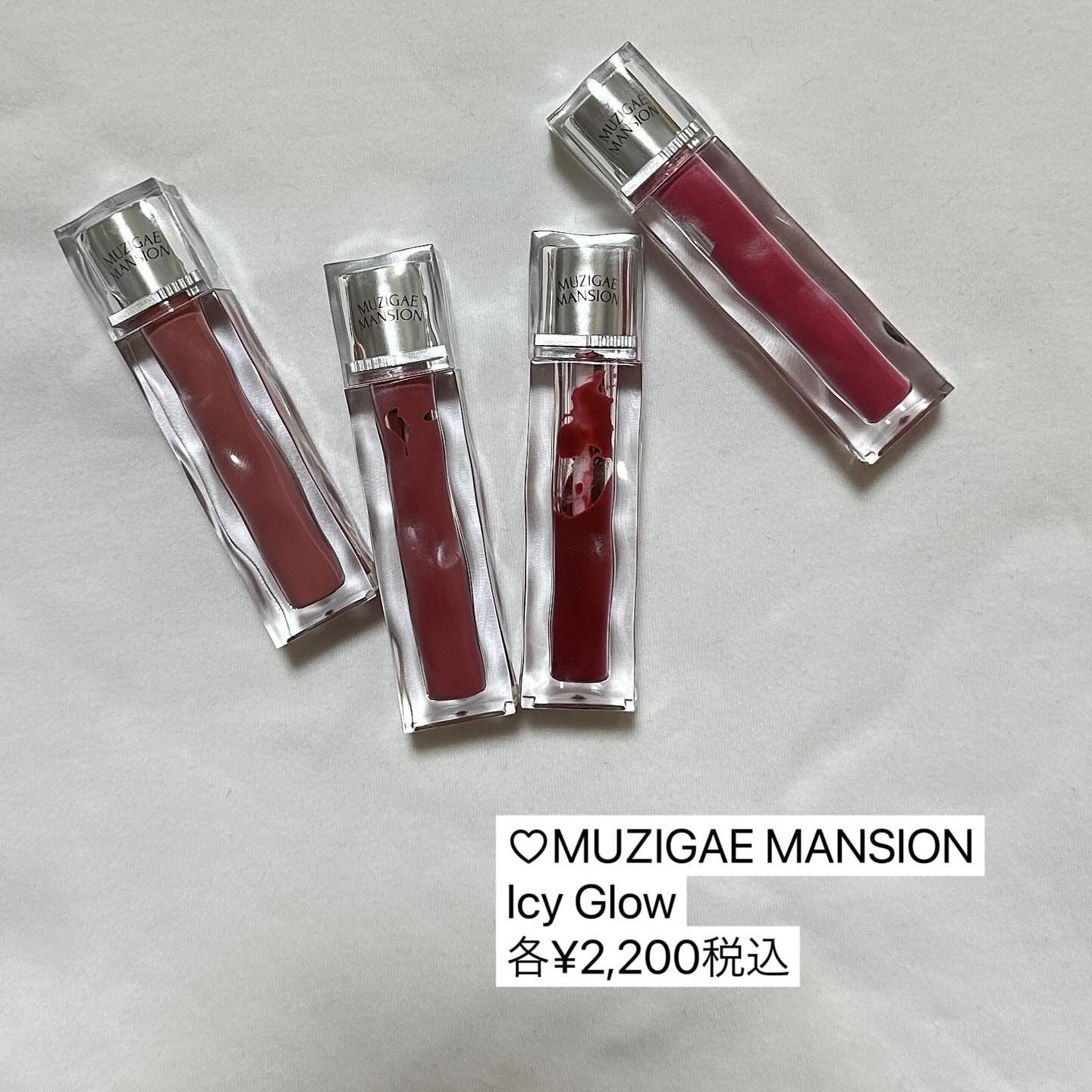 - ムジゲマンションの3つ目のコレクション アイシーグロウはアイスキューブを 洗練された感覚で表現したグロッシーティントです。 アイシーグロウはムジゲマンションのラインナップの中で、最も澄んだ華麗さを感じられるコレクションで、うっすら溶けた氷が作り出す 水光のように水気のあるしっとりとしたリップを演出します。 半透明な処方が本来の唇の色と調和し、幻想的で混じりけのない神秘な雰囲気を醸し出し、 好奇心を動かします。