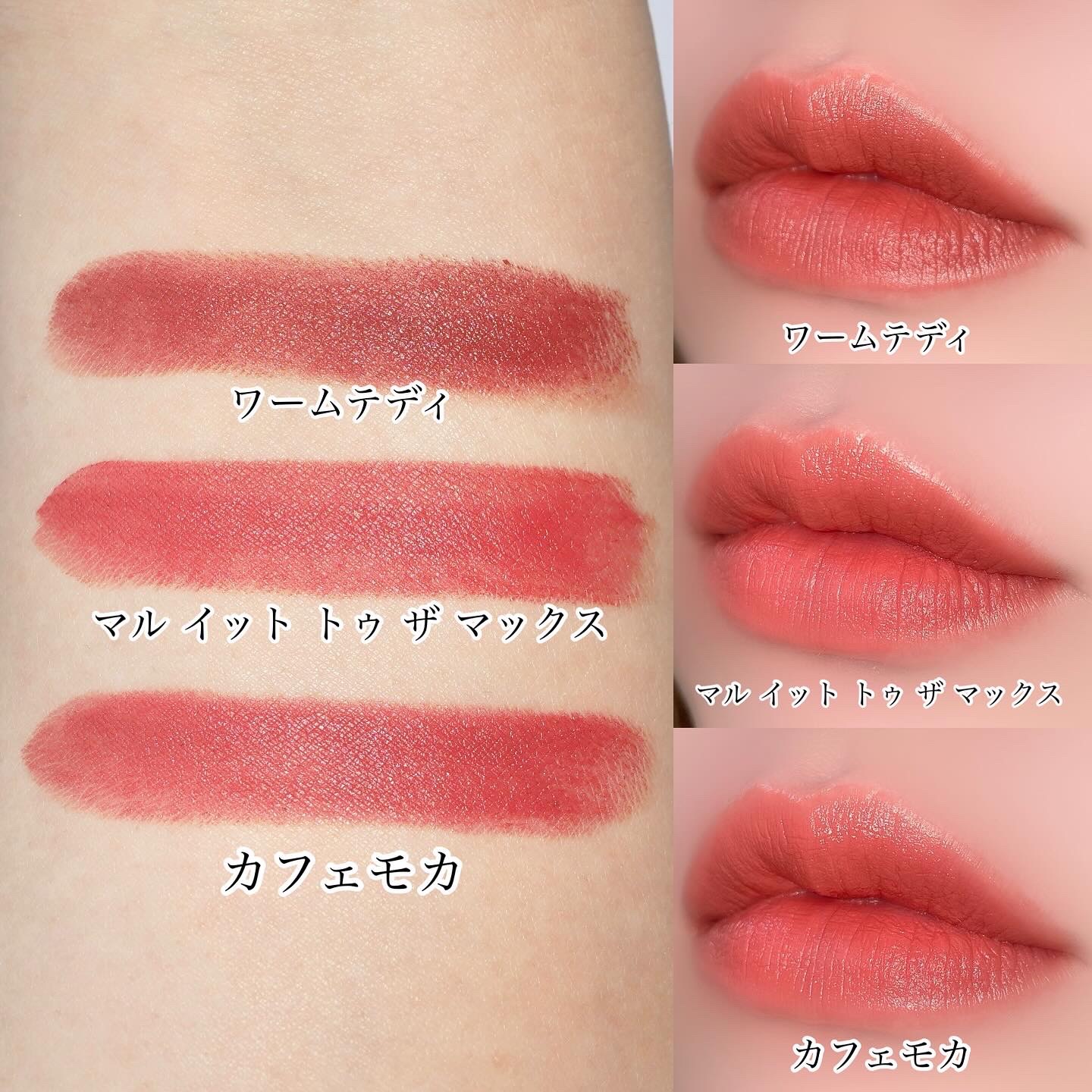 とにかく質感がしーっとりととろけるバームテクスチャーで、保湿力はかなり高い! 少しペタペタもしますが密着力もあるので色持ち良し♪ マスクレスの時にぜひ使いたいぷるぷるでツヤがきれいな仕上がりです。 カラー展開も豊富で、イエベさん向けブルベさん向け揃ってます☆ 私のお気に入りは01と05♡ そして08 Coraliaも可愛くって好き! 6月からドラッグストアにも展開予定だそうですよ♡