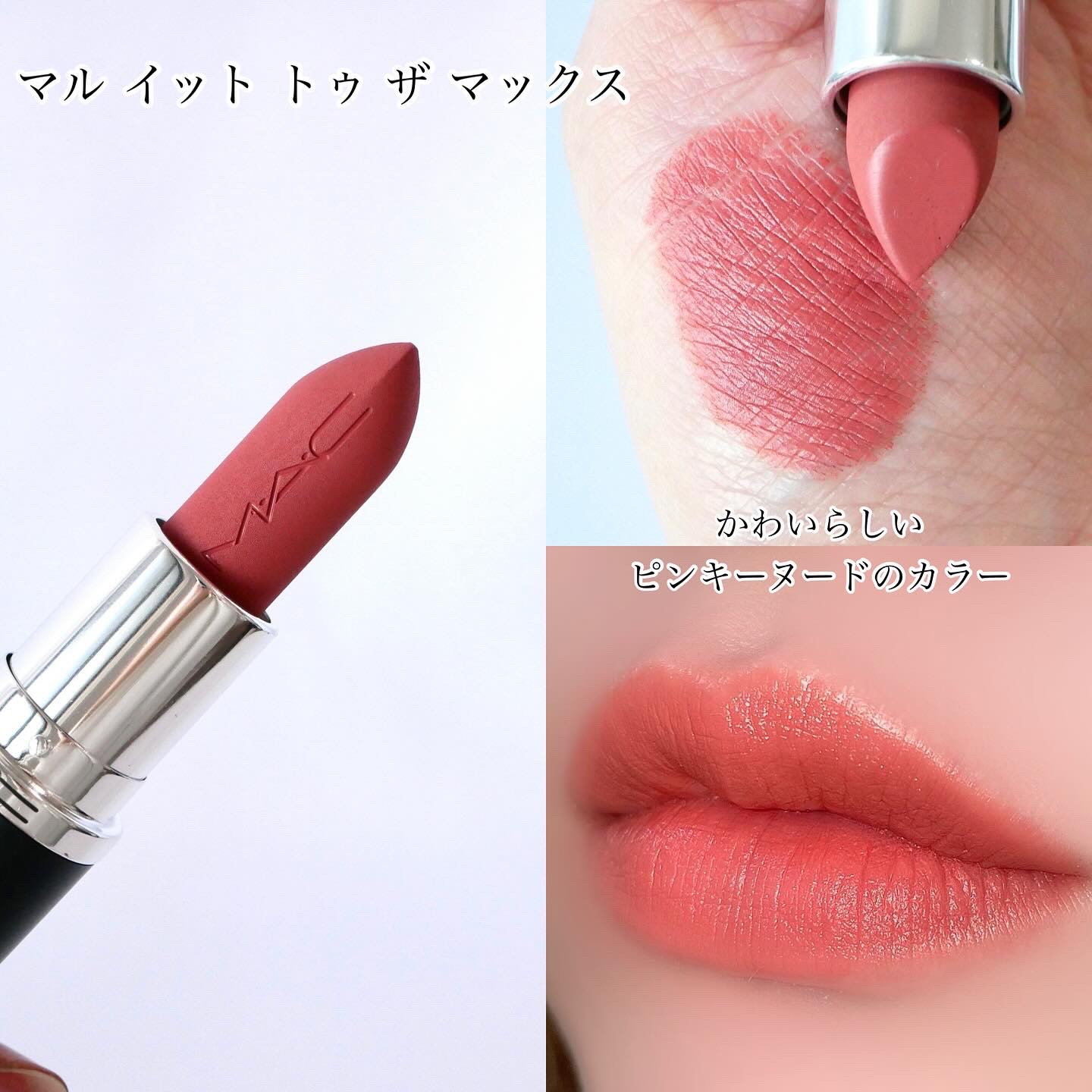 - <価格改定>2025年7月1日より¥4,620(税込)から¥4,400(税込)に改定いたします。 マットリップはここまで進化。 色もち12時間*続くのに乾燥レスな新感覚 ”オイルinマット” M・A・Cのマキシマル誕生。 毎日つけたくなるような、 バームのようななめらかな質感とつけ心地が12時間持続*。 ありのままの自分から、 さらに一歩先へ踏み出せるような自信を唇に *化粧持ち(色持ち)データ取得済み。(当社調べ。効果には個人差があります。) ①リッチな発色とカラーラインナップ M・A・C独自のテクノロジー、リッチピグメントフォーミュラにより鮮やかな発色を実現。 人気色を継続しながらも、新たにアーティストが厳選した25シェードは、 一人一人の個性やスタイル、魅力を高め、存在感を放つit カラーをラインナップ。 ②ストレスフリーなつけ心地 マットテクスチャー=乾燥しやすいというネガティブイメージを払拭する、オイル in マット フォーミュラ。 自然由来のオーガニックのシアバター、ココアバター、ココナッツオイル配合**で濃密な潤いを与え、驚きのなめらかな付け心地とフィット感を叶えた。 香りは、シグネチャーであるバニラを継続。 **シアバター:シア脂(保湿成分) 、ココアバター:カカオ脂(保湿成分) 、ココナッツオイル:ヤシ油(保湿成分) ③12時間持続*というラスティング力 ピタリと唇に密着しながらもしなやかに寄り添い、鮮やかな発色、つけ心地が12時間*持続。 唇をティントのように染めずに、それでいてどんな瞬間も自信の持てる唇に。 *化粧もちデータ取得済み (当社調べ、効果には個人差があります) ④魅力的な新パッケージ 再生プラスチックを約30%採用した、環境にやさしい新パッケージへとパワーアップ。 程よく重厚感のある感触はラグジュアリーな気持ちを高めてくれる。 また、リップにはM・A・Cのエンボス加工も。