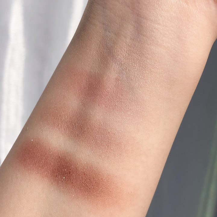 このカラー見ての通りとっても使いやすくてかわいいよ🥹 涙袋にのせると自然なぷっくりとした涙袋ができる 目のどこに塗ってもパッと華やかに明るくしてくれるカラー このカラーがキーポイントな気がする! ブラシで入れるかチップで入れるかによっても雰囲気を変えられる魔法のカラー 個人的に締め色って苦手でほとんど使わないんだけど、スキニーリッチシャドウの締め色は使っちゃうんだよねぇ… 透け感があるのでブラシでふんわり入れてもグラデーションになるし チップでのせるとアイラインっぽくも使える◎ 今回は付属のダブルエンドのブラシの細い方でアイラインっぽく引いてメイクしてみました👀 この付属のブラシがまた使いやすい! 毎日メイクにも使いやすいローズブラウン🥀