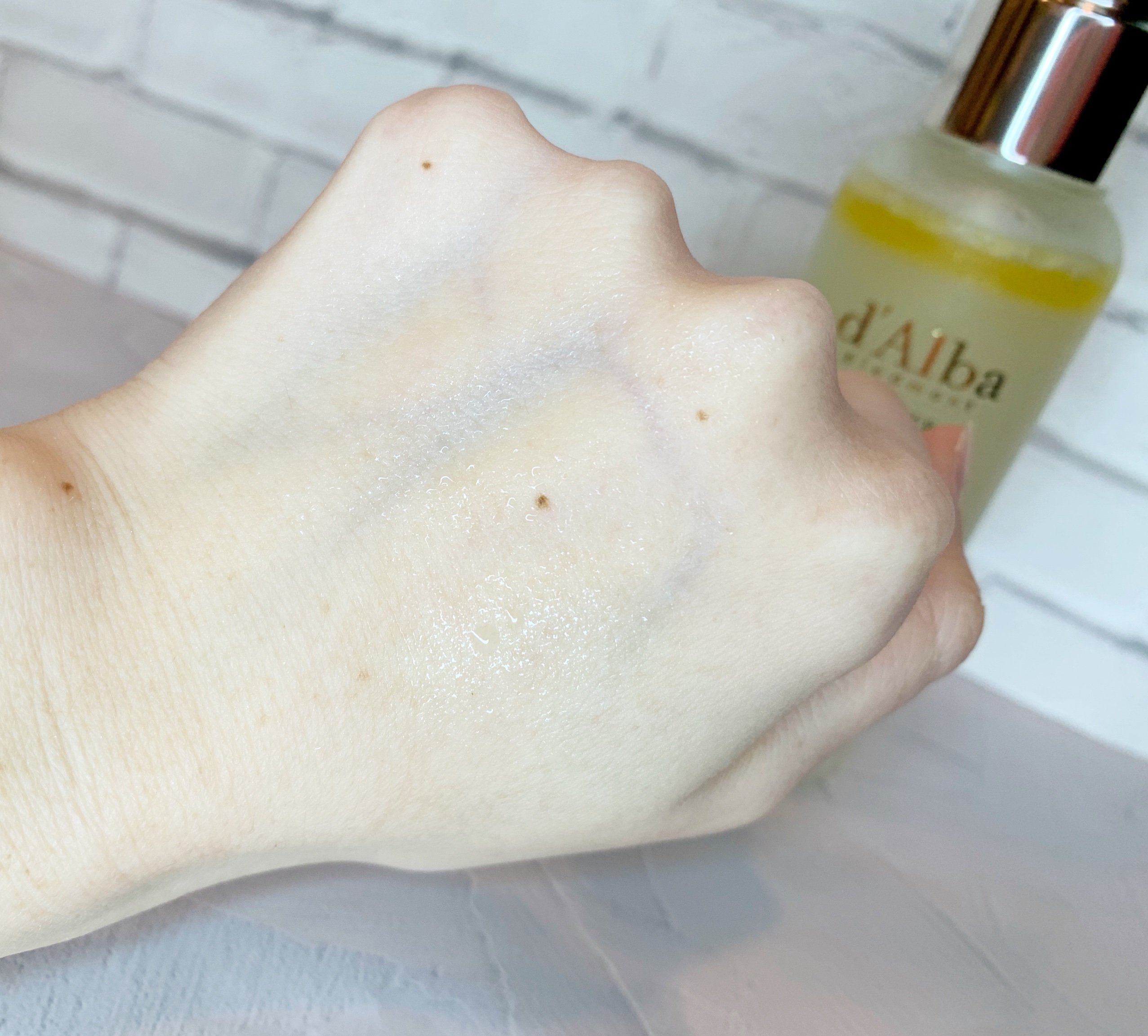 高級感のある透明のボトルからは中が2層になっているのがよく見えます。上の方が黄色く、下は透明です。 イタリア産ホワイトトリュフが入っているセラムです。オイルの層はボトルを振るとすぐに混ざります。 シュッシュッとお肌にかけてふんわりいい香りを楽しみます。とってもいい香りがするんですよ。
