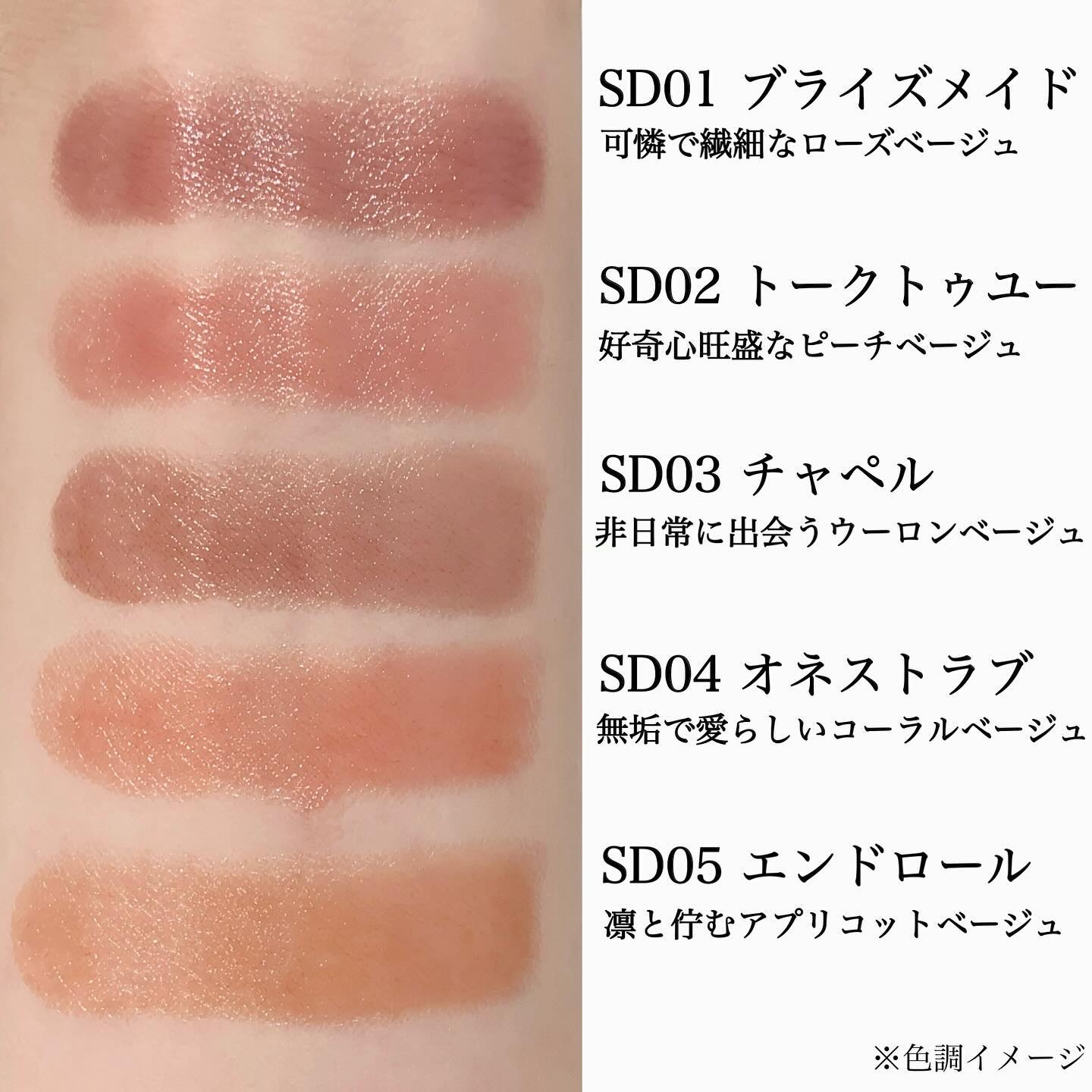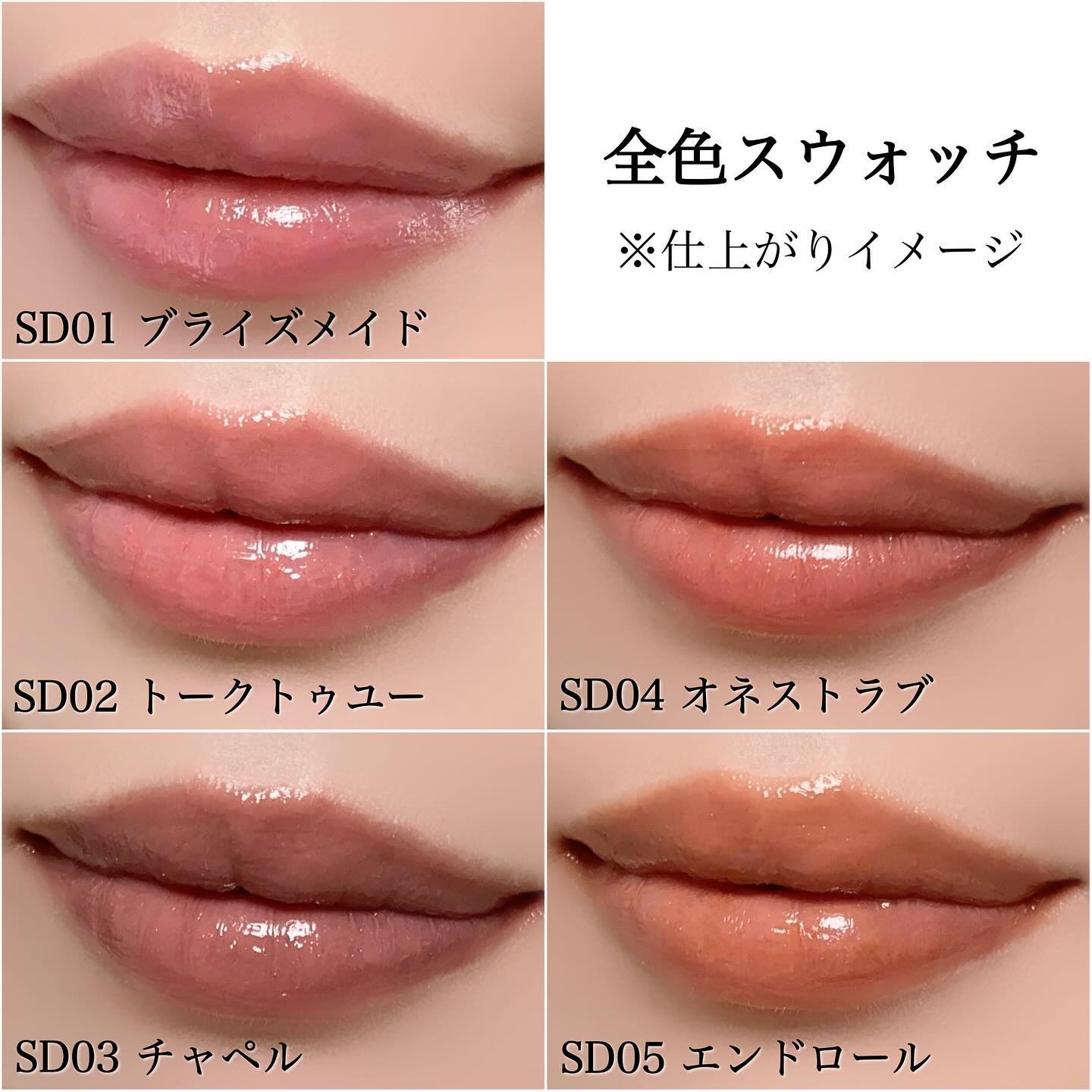 - <SD01 ブライズメイド> 水添ポリイソブテン、トリエチルヘキサノイン、ダイマージリノール酸ジ(イソステアリル/フィトステリル)、デカイソステアリン酸ポリグリセリル-10、トリメチルペンタフェニルトリシロキサン、合成ワックス、リンゴ酸ジイソステアリル、ジフェニルシロキシフェニルトリメチコン、ワセリン、トリメチルシロキシフェニルジメチコン、マイクロクリスタリンワックス、バニリルブチル、メントキシプロパンジオール、ヒアルロン酸クロスポリマーNa、加水分解コラーゲン、ホホバ種子油、オリーブ果実油、ブドウ種子油、マカデミア種子油、アボカド油、アルガニアスピノサ核油、カニナバラ果実油、アーモンド油、アンズ核油、メドウフォーム種子油、(ジイソステアリン酸/ポリヒドロキシステアリン酸/セバシン酸)ポリグリセリル-4、イソステアリン酸Na、カルナウバロウ、キャンデリラロウエステルズ、ステアリン酸エチルヘキシル、セスキイソステアリン酸ソルビタン、トコフェロール、ハイドロゲンジメチコン、ホウケイ酸(Ca/Al)、水、(+/-)シリカ、ラウロイルリシン、黄4、黄5、酸化チタン、酸化鉄、水酸化Al、青1、赤201、赤202 <SD02 トークトゥユー > 水添ポリイソブテン、トリエチルヘキサノイン、ダイマージリノール酸ジ(イソステアリル/フィトステリル)、デカイソステアリン酸ポリグリセリル-10、トリメチルペンタフェニルトリシロキサン、合成ワックス、リンゴ酸ジイソステアリル、ジフェニルシロキシフェニルトリメチコン、ワセリン、トリメチルシロキシフェニルジメチコン、マイクロクリスタリンワックス、バニリルブチル、メントキシプロパンジオール、ヒアルロン酸クロスポリマーNa、加水分解コラーゲン、ホホバ種子油、オリーブ果実油、ブドウ種子油、マカデミア種子油、アボカド油、アルガニアスピノサ核油、カニナバラ果実油、アーモンド油、アンズ核油、メドウフォーム種子油、(ジイソステアリン酸/ポリヒドロキシステアリン酸/セバシン酸)ポリグリセリル-4、イソステアリン酸Na、カルナウバロウ、キャンデリラロウエステルズ、ステアリン酸エチルヘキシル、セスキイソステアリン酸ソルビタン、トコフェロール、ハイドロゲンジメチコン、ホウケイ酸(Ca/Al)、水、(+/-)シリカ、ラウロイルリシン、黄4、黄5、酸化チタン、酸化鉄、水酸化Al、青1、赤201、赤202 <SD03 チャペル> 水添ポリイソブテン、トリエチルヘキサノイン、ダイマージリノール酸ジ(イソステアリル/フィトステリル)、デカイソステアリン酸ポリグリセリル-10、トリメチルペンタフェニルトリシロキサン、合成ワックス、リンゴ酸ジイソステアリル、ジフェニルシロキシフェニルトリメチコン、ワセリン、トリメチルシロキシフェニルジメチコン、マイクロクリスタリンワックス、バニリルブチル、メントキシプロパンジオール、ヒアルロン酸クロスポリマーNa、加水分解コラーゲン、ホホバ種子油、オリーブ果実油、ブドウ種子油、マカデミア種子油、アボカド油、アルガニアスピノサ核油、カニナバラ果実油、アーモンド油、アンズ核油、メドウフォーム種子油、(ジイソステアリン酸/ポリヒドロキシステアリン酸/セバシン酸)ポリグリセリル-4、イソステアリン酸Na、カルナウバロウ、キャンデリラロウエステルズ、ステアリン酸エチルヘキシル、セスキイソステアリン酸ソルビタン、トコフェロール、ハイドロゲンジメチコン、ホウケイ酸(Ca/Al)、水、(+/-)シリカ、ラウロイルリシン、黄4、黄5、酸化チタン、酸化鉄、水酸化Al、青1、赤201、赤202 <SD04 オネストラブ> 水添ポリイソブテン、トリエチルヘキサノイン、ダイマージリノール酸ジ(イソステアリル/フィトステリル)、デカイソステアリン酸ポリグリセリル-10、トリメチルペンタフェニルトリシロキサン、合成ワックス、リンゴ酸ジイソステアリル、ジフェニルシロキシフェニルトリメチコン、ワセリン、トリメチルシロキシフェニルジメチコン、マイクロクリスタリンワックス、バニリルブチル、メントキシプロパンジオール、ヒアルロン酸クロスポリマーNa、加水分解コラーゲン、ホホバ種子油、オリーブ果実油、ブドウ種子油、マカデミア種子油、アボカド油、アルガニアスピノサ核油、カニナバラ果実油、アーモンド油、アンズ核油、メドウフォーム種子油、(ジイソステアリン酸/ポリヒドロキシステアリン酸/セバシン酸)ポリグリセリル-4、イソステアリン酸Na、カルナウバロウ、キャンデリラロウエステルズ、ステアリン酸エチルヘキシル、セスキイソステアリン酸ソルビタン、トコフェロール、ハイドロゲンジメチコン、ホウケイ酸(Ca/Al)、水、(+/-)シリカ、ラウロイルリシン、黄4、黄5、酸化チタン、酸化鉄、水酸化Al、青1、赤201、赤202 <SD05 エンドロール> 水添ポリイソブテン、トリエチルヘキサノイン、ダイマージリノール酸ジ(イソステアリル/フィトステリル)、デカイソステアリン酸ポリグリセリル-10、トリメチルペンタフェニルトリシロキサ