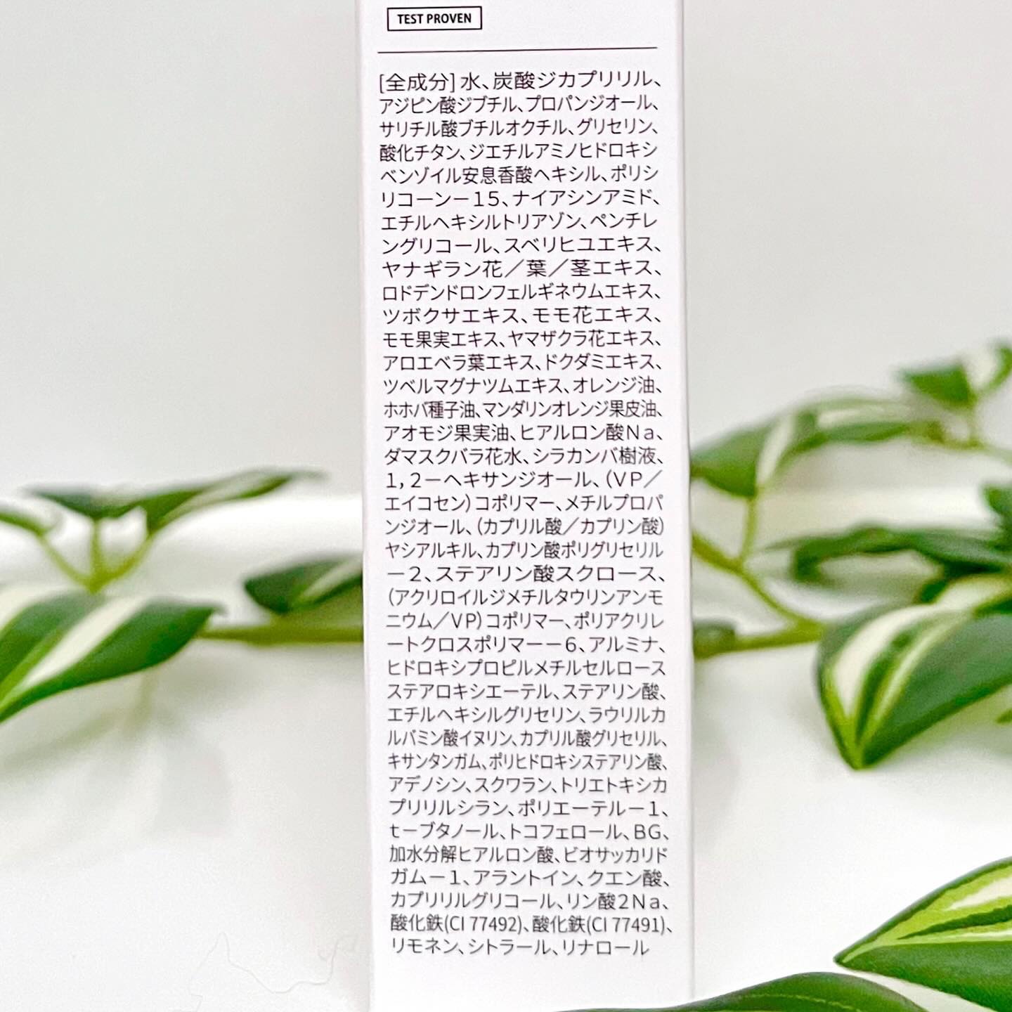 - <ピンク> 水、酸化チタン、ペンチレングリコール、BG、グリセリン、ヒアルロン酸Na、加水分解ヒアルロン酸、キサンタンガム、スクワラン、トコフェロール、アロエベラ葉エキス、ホホバ種子油、アルミナ、ステアリン酸、アジピン酸ジブチル、プロパンジオール、カプリリルグリコール、ポリヒドロキシステアリン酸、ヒドロキシプロピルメチルセルロースステアロキシエーテル、炭酸ジカプリリル、エチルヘキシルグリセリン、ツボクサエキス、ドクダミエキス、スベリヒユエキス、トリエトキシカプリリルシラン、アオモジ果実油、クエン酸、カプリル酸グリセリル、ロドデンドロンフェルギネウムエキス、1,2-ヘキサンジオール、アラントイン、ステアリン酸スクロース、オレンジ油、(アクリロイルジメチルタウリンアンモニウム/VP)コポリマー、ダマスクバラ花水、ナイアシンアミド、ラウリルカルバミン酸イヌリン、マンダリンオレンジ果皮油、(カプリル酸/カプリン酸)ヤシアルキル、リン酸2Na、リモネン、リナロール、シトラール、シラカンバ樹液、メチルプロパンジオール、アデノシン、ジエチルアミノヒドロキシベンゾイル安息香酸ヘキシル、ヤマザクラ花エキス、ビオサッカリドガム-1、t-ブタノール、ポリアクリレートクロスポリマー-6、ポリシリコーン-15、モモ果実エキス、ツベルマグナツムエキス、エチルヘキシルトリアゾン、ヤナギラン花/葉/茎エキス、(VP/エイコセン)コポリマー、カプリン酸ポリグリセリル-2、モモ花エキス、サリチル酸ブチルオクチル、ポリエーテル-1、酸化鉄(CI 77492)、酸化鉄(CI 77491)
