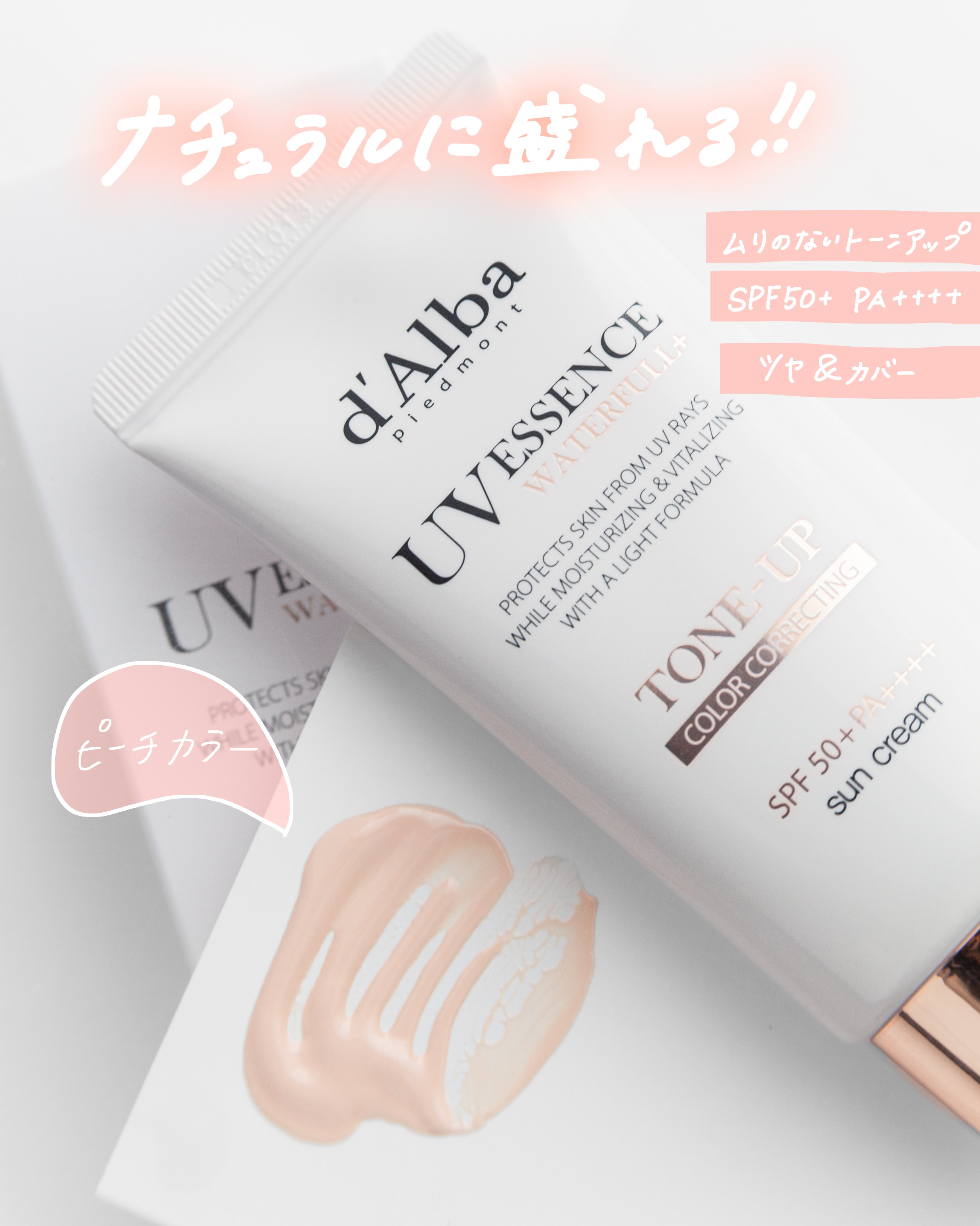 - <ピンク> 水、酸化チタン、ペンチレングリコール、BG、グリセリン、ヒアルロン酸Na、加水分解ヒアルロン酸、キサンタンガム、スクワラン、トコフェロール、アロエベラ葉エキス、ホホバ種子油、アルミナ、ステアリン酸、アジピン酸ジブチル、プロパンジオール、カプリリルグリコール、ポリヒドロキシステアリン酸、ヒドロキシプロピルメチルセルロースステアロキシエーテル、炭酸ジカプリリル、エチルヘキシルグリセリン、ツボクサエキス、ドクダミエキス、スベリヒユエキス、トリエトキシカプリリルシラン、アオモジ果実油、クエン酸、カプリル酸グリセリル、ロドデンドロンフェルギネウムエキス、1,2-ヘキサンジオール、アラントイン、ステアリン酸スクロース、オレンジ油、(アクリロイルジメチルタウリンアンモニウム/VP)コポリマー、ダマスクバラ花水、ナイアシンアミド、ラウリルカルバミン酸イヌリン、マンダリンオレンジ果皮油、(カプリル酸/カプリン酸)ヤシアルキル、リン酸2Na、リモネン、リナロール、シトラール、シラカンバ樹液、メチルプロパンジオール、アデノシン、ジエチルアミノヒドロキシベンゾイル安息香酸ヘキシル、ヤマザクラ花エキス、ビオサッカリドガム-1、t-ブタノール、ポリアクリレートクロスポリマー-6、ポリシリコーン-15、モモ果実エキス、ツベルマグナツムエキス、エチルヘキシルトリアゾン、ヤナギラン花/葉/茎エキス、(VP/エイコセン)コポリマー、カプリン酸ポリグリセリル-2、モモ花エキス、サリチル酸ブチルオクチル、ポリエーテル-1、酸化鉄(CI 77492)、酸化鉄(CI 77491)