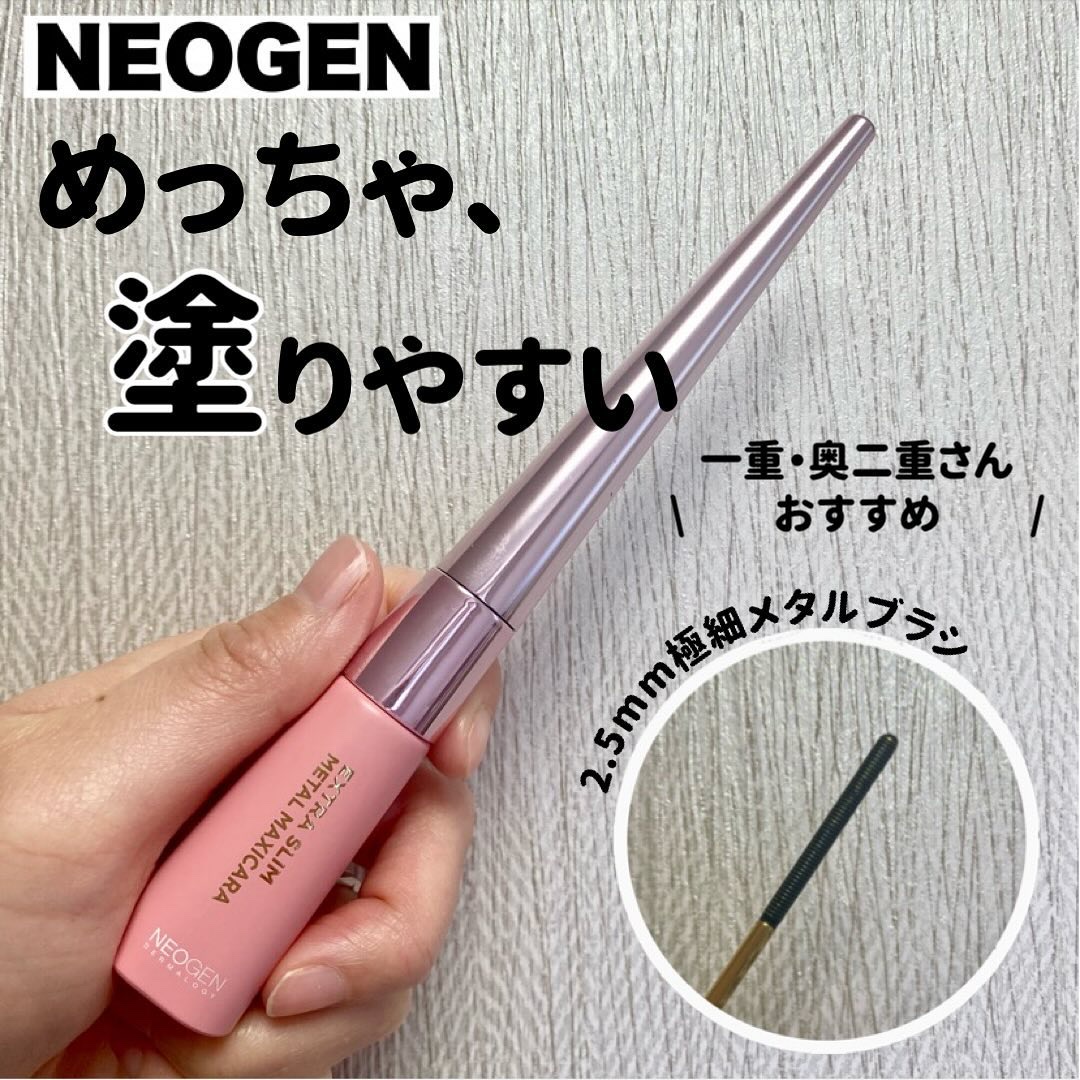 NEOGENの人気マスカラがリニューアルして登場🪐꙳☄︎ 以前と比べて持ち手部分が少し短くなりコンパクトになったので持ち運びしやすいサイズに👜 精密設計ブラシでまつ毛一本一本を根本から繊細カールを作ってくれる🪄 普通のブラシと比べるとダマができづらく、極細ブラシなので下まつ毛にも塗りやすい🫶🏻 メタルブラシなので拭き取りができ衛生的に使えるところもポイント🫧