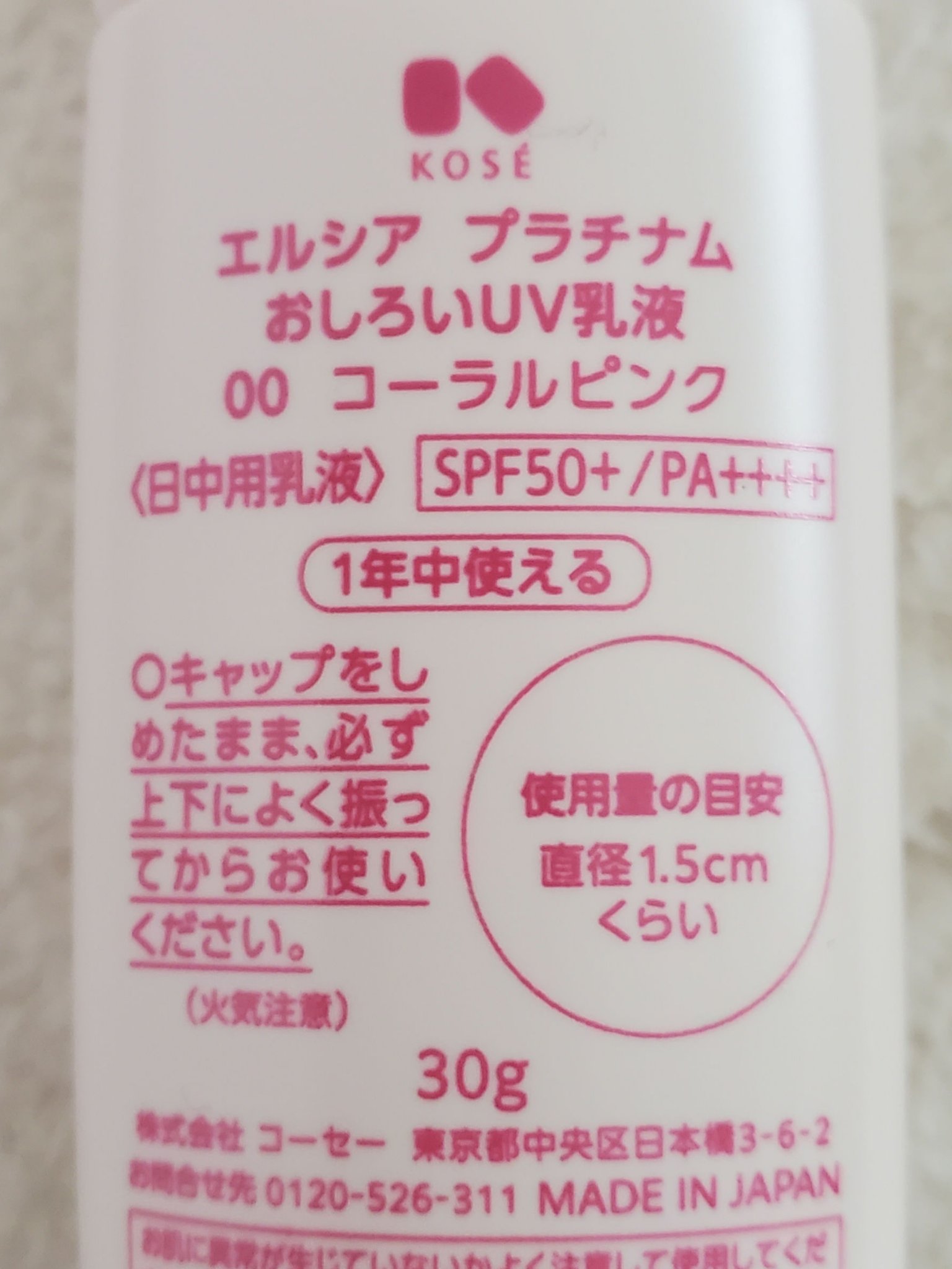 【エルシア】おしろいUV乳液00コーラルピンクSPF50+PA++++後ろ面を見ると量の目安表記もわかり易くされています🐥💓パッケージに表記されている効果一覧◎UVカット◎薄化粧効果◎保湿◎化粧崩れ防止◎化粧下地◎美白効果日焼け止め効果も十分...
