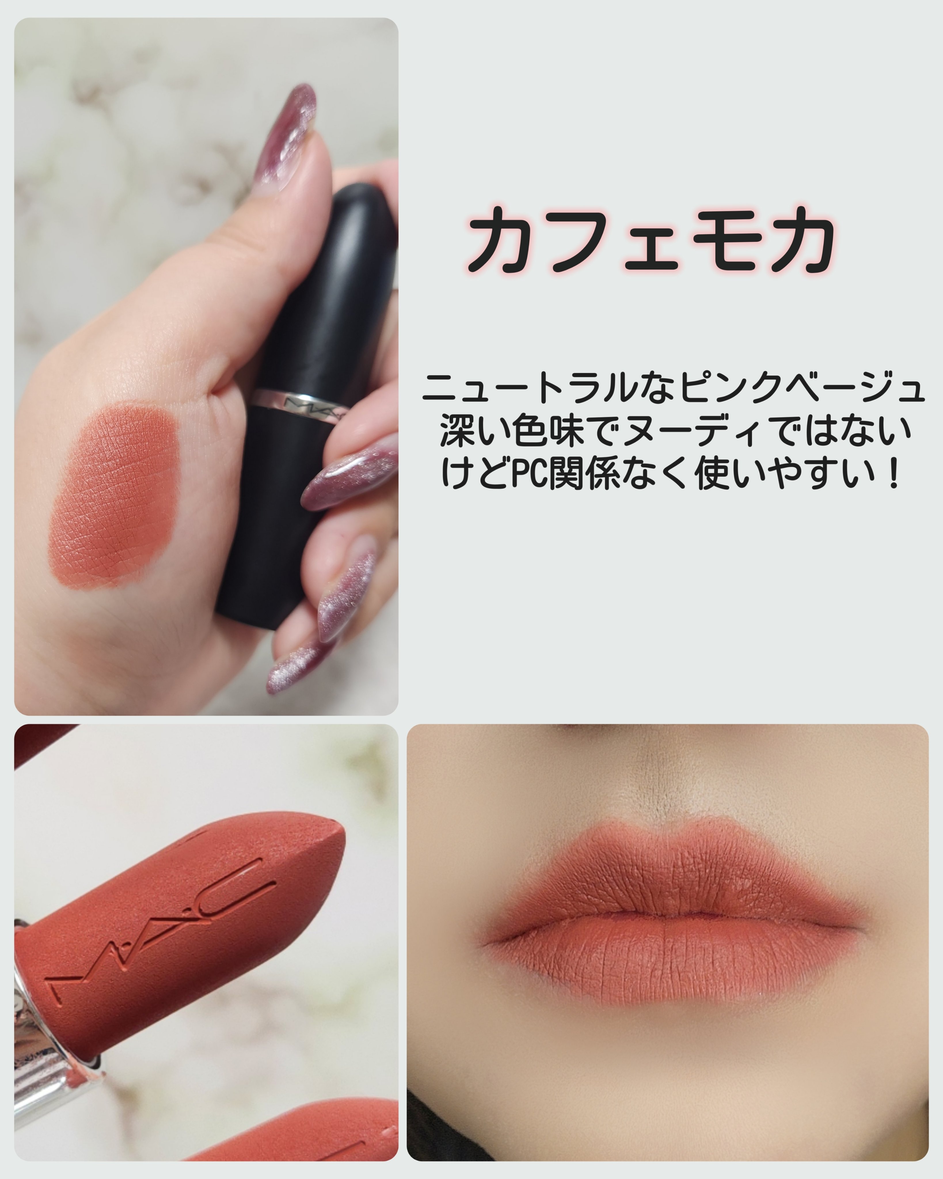 - <価格改定>2025年7月1日より¥4,620(税込)から¥4,400(税込)に改定いたします。 マットリップはここまで進化。 色もち12時間*続くのに乾燥レスな新感覚 ”オイルinマット” M・A・Cのマキシマル誕生。 毎日つけたくなるような、 バームのようななめらかな質感とつけ心地が12時間持続*。 ありのままの自分から、 さらに一歩先へ踏み出せるような自信を唇に *化粧持ち(色持ち)データ取得済み。(当社調べ。効果には個人差があります。) ①リッチな発色とカラーラインナップ M・A・C独自のテクノロジー、リッチピグメントフォーミュラにより鮮やかな発色を実現。 人気色を継続しながらも、新たにアーティストが厳選した25シェードは、 一人一人の個性やスタイル、魅力を高め、存在感を放つit カラーをラインナップ。 ②ストレスフリーなつけ心地 マットテクスチャー=乾燥しやすいというネガティブイメージを払拭する、オイル in マット フォーミュラ。 自然由来のオーガニックのシアバター、ココアバター、ココナッツオイル配合**で濃密な潤いを与え、驚きのなめらかな付け心地とフィット感を叶えた。 香りは、シグネチャーであるバニラを継続。 **シアバター:シア脂(保湿成分) 、ココアバター:カカオ脂(保湿成分) 、ココナッツオイル:ヤシ油(保湿成分) ③12時間持続*というラスティング力 ピタリと唇に密着しながらもしなやかに寄り添い、鮮やかな発色、つけ心地が12時間*持続。 唇をティントのように染めずに、それでいてどんな瞬間も自信の持てる唇に。 *化粧もちデータ取得済み (当社調べ、効果には個人差があります) ④魅力的な新パッケージ 再生プラスチックを約30%採用した、環境にやさしい新パッケージへとパワーアップ。 程よく重厚感のある感触はラグジュアリーな気持ちを高めてくれる。 また、リップにはM・A・Cのエンボス加工も。