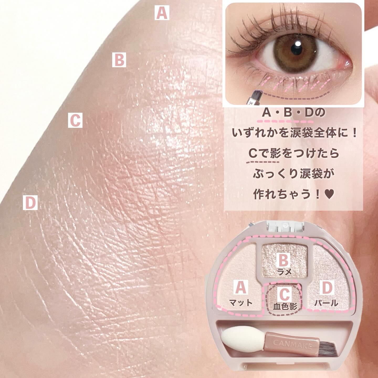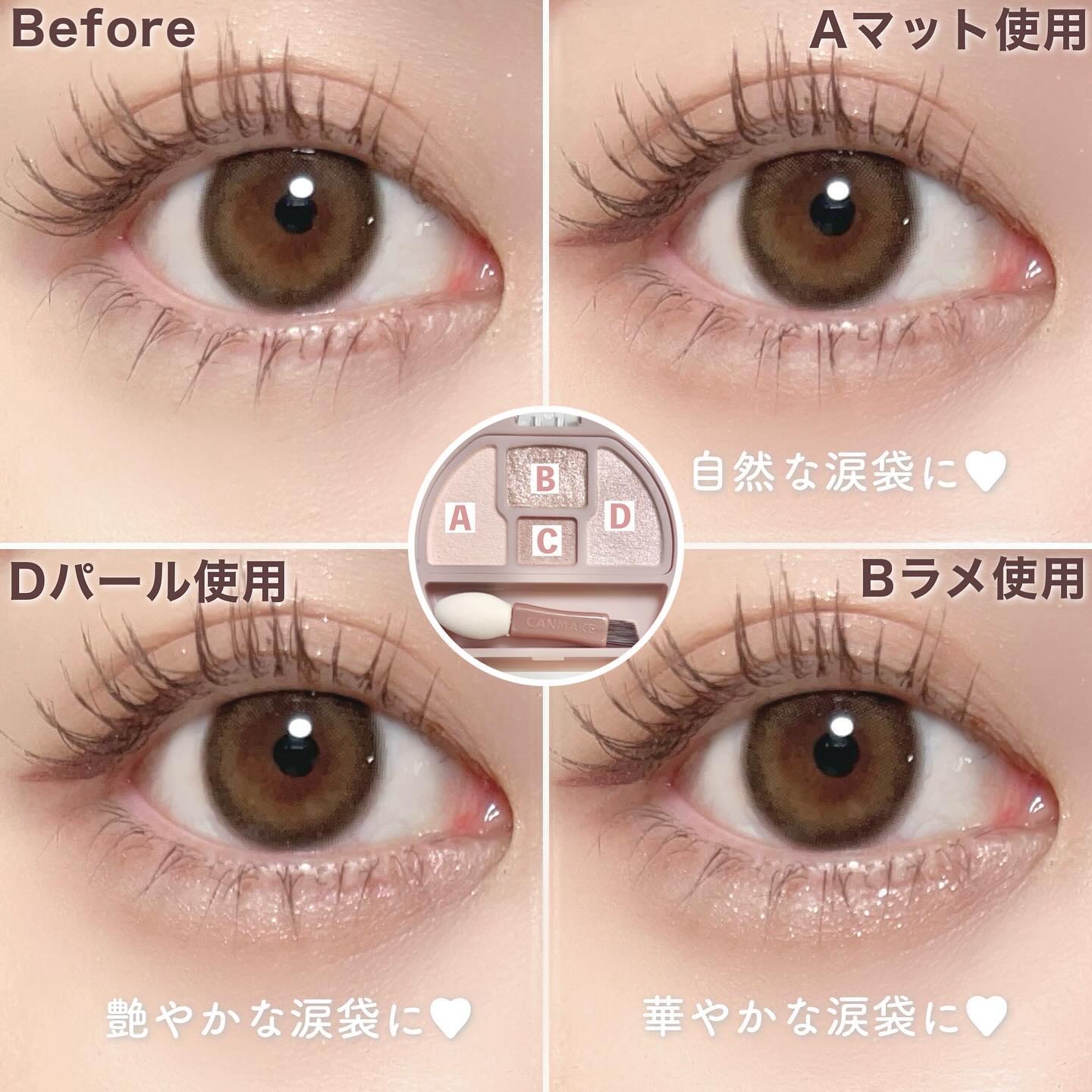 - マット・パール・ラメ入りで3パターンの涙袋が作れる 涙袋用アイシャドウパレット 涙袋用に3色、涙袋の影用に1色がセットされた涙袋用のアイシャドウパレットです。 その日の気分やTPOに合わせて選んでみてくださいね! マットは透け感があり目元のシワが気になりにくく、 パールは繊細で透明感のあるツヤっとした仕上がりに、 ラメはキラキラと輝く透け発色です。 涙袋の影用の「血色影カラー」は、影寄りの色なのに血色感もあって目元が暗くならない パウダーだからこそできた絶妙な色味なんです!