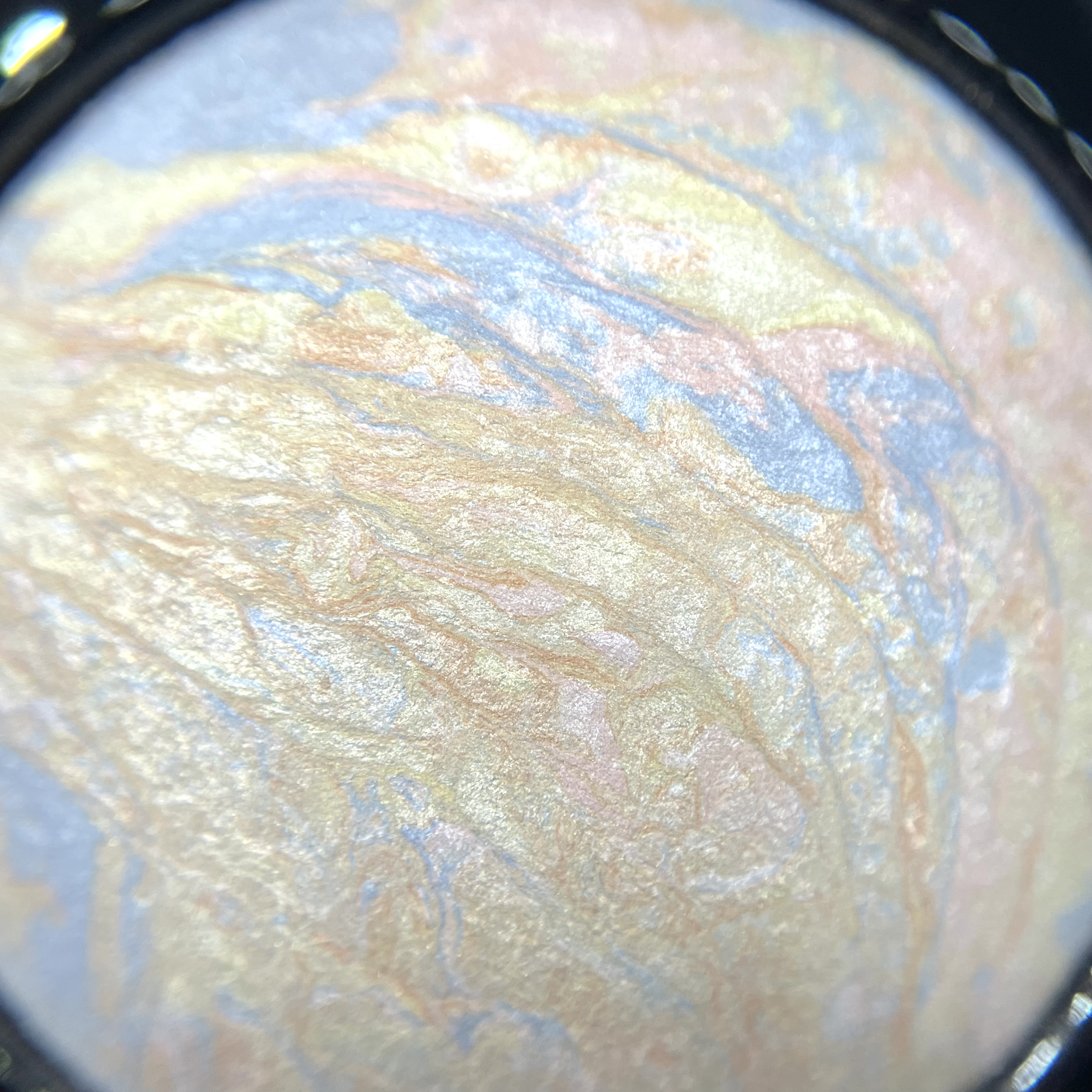 見た目が美しい〜❤️ 見るだけ、持ち歩くだけでわくわくしちゃう綺麗なマーブル模様のハイライター。 ベージュ、ピンク、ホワイト、ブルーなどの色のマーブル模様なので、ブラシで取る場所によって色味が少しずつ変わります。 粉の粒?がデパコスの中でも大きめのような?