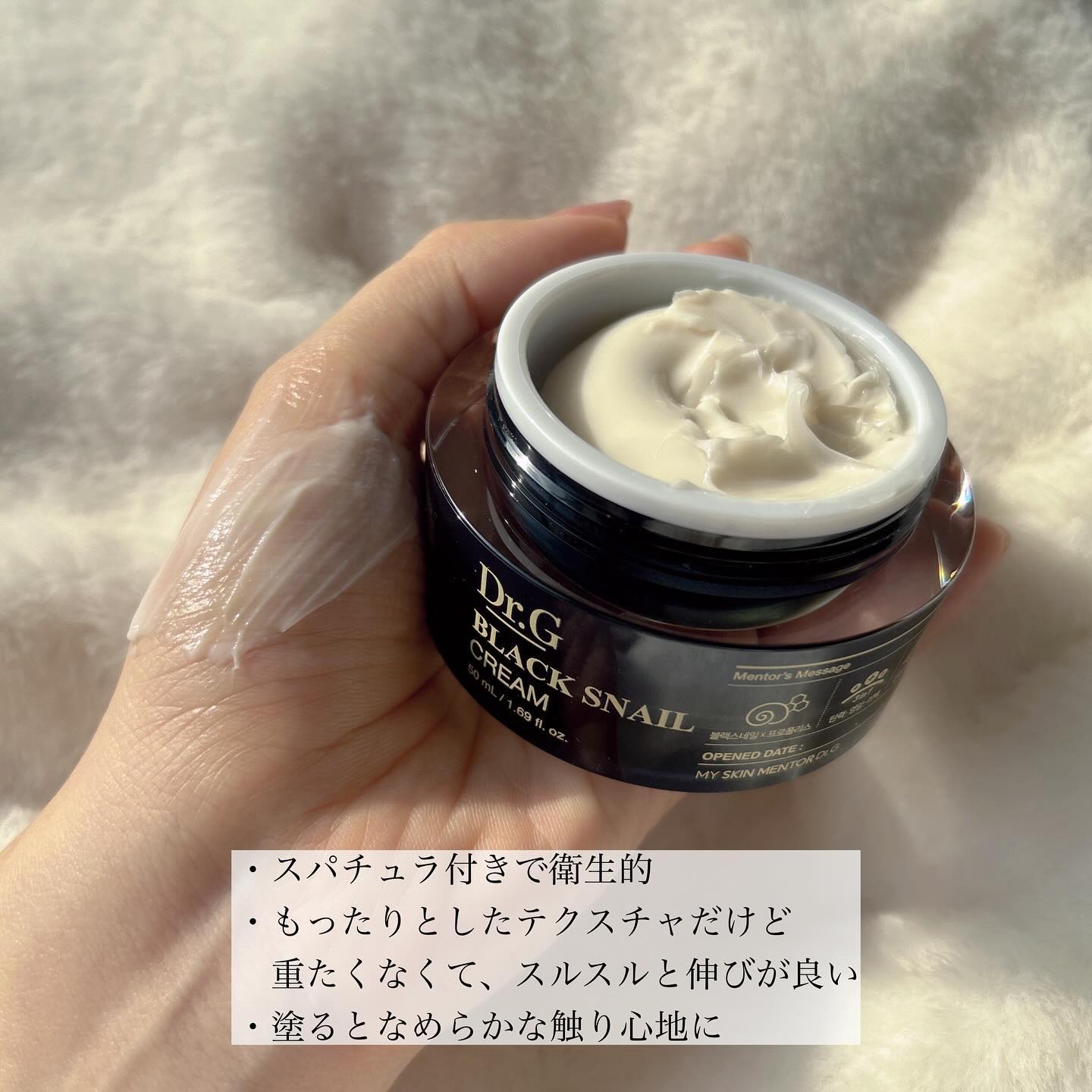 ブラックスネイルと低刺激のレチノールを配合した美容液 とろみがあってミルキーなテクスチャー なめらかにすべるように伸びて気持ちいい使用感で好き ブラックスネイル20%配合クリーム もっちりとした弾力を感じるテクスチャー なめらかに伸びてべたつかない Dr.Gが開発した独自成分のブラックスネイルレチノールは刺激が少なく効果的◎ アトピーもちの敏感肌、乾燥肌だけどトラブルなく使えてるよ♪