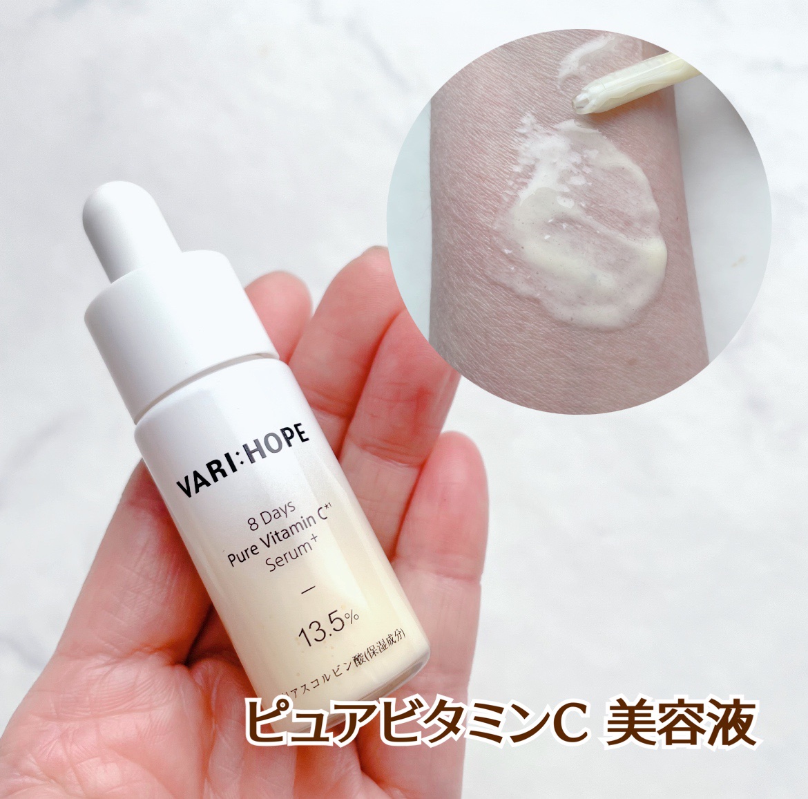 使っているのは“ ビタミンC誘導体 ”じゃなくて【ピュアビタミンC】 純粋ビタミンC※を使っているのが、VARI:HOPE(ベリーホップ)の強みですよね。 ビタミンC美容液は、使う直前に密閉されている蓋を開けてスポイトをセットして使います。 しっとりとした使い心地なのにべたつかないので、新しいビタミンCコスメだな という印象をもちました。
